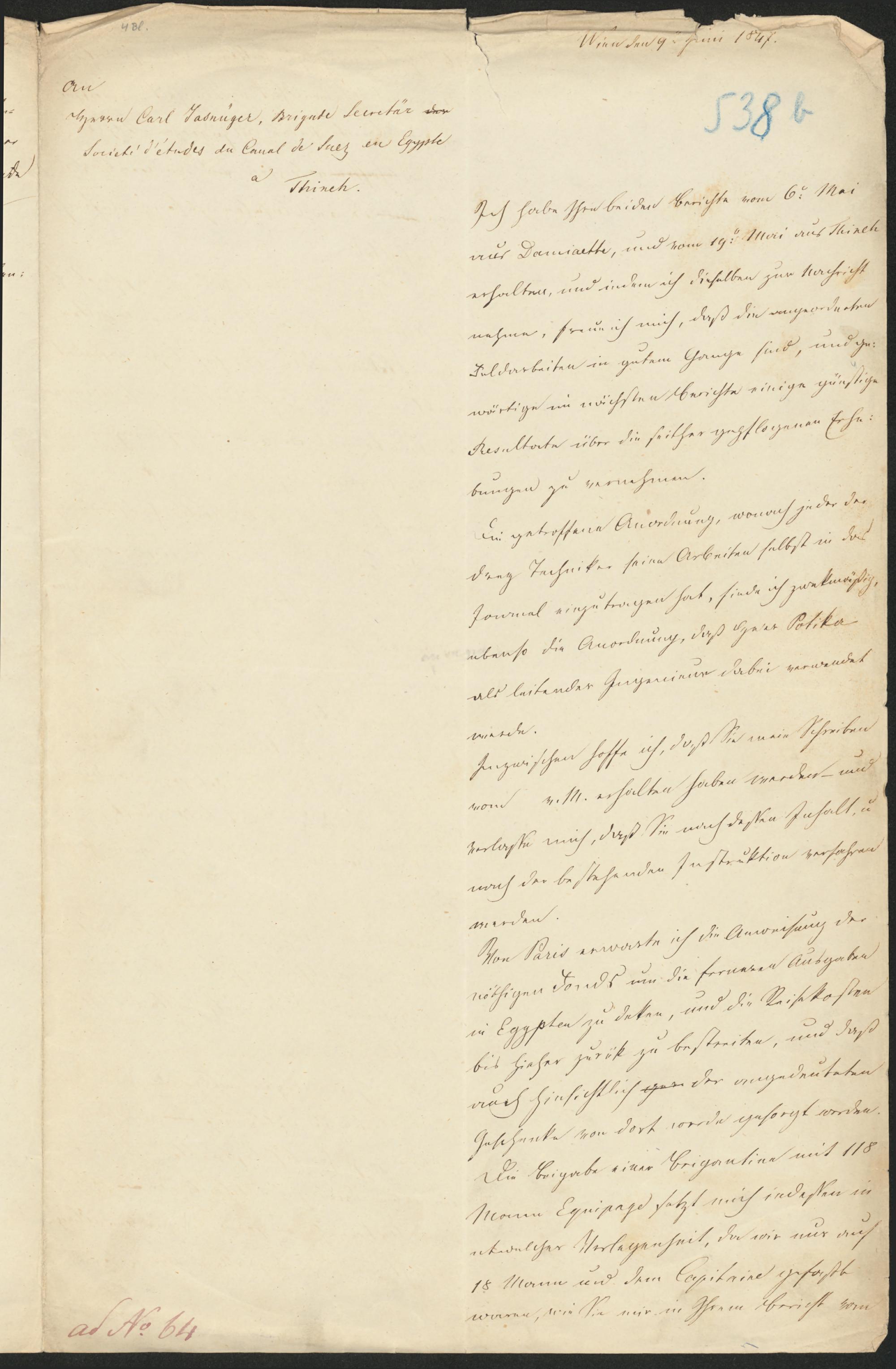 AnHerrn Carl Jasnüger, Brigade Secretär derSociete d'etudes du Canal de Suez in EgypteaThineh.