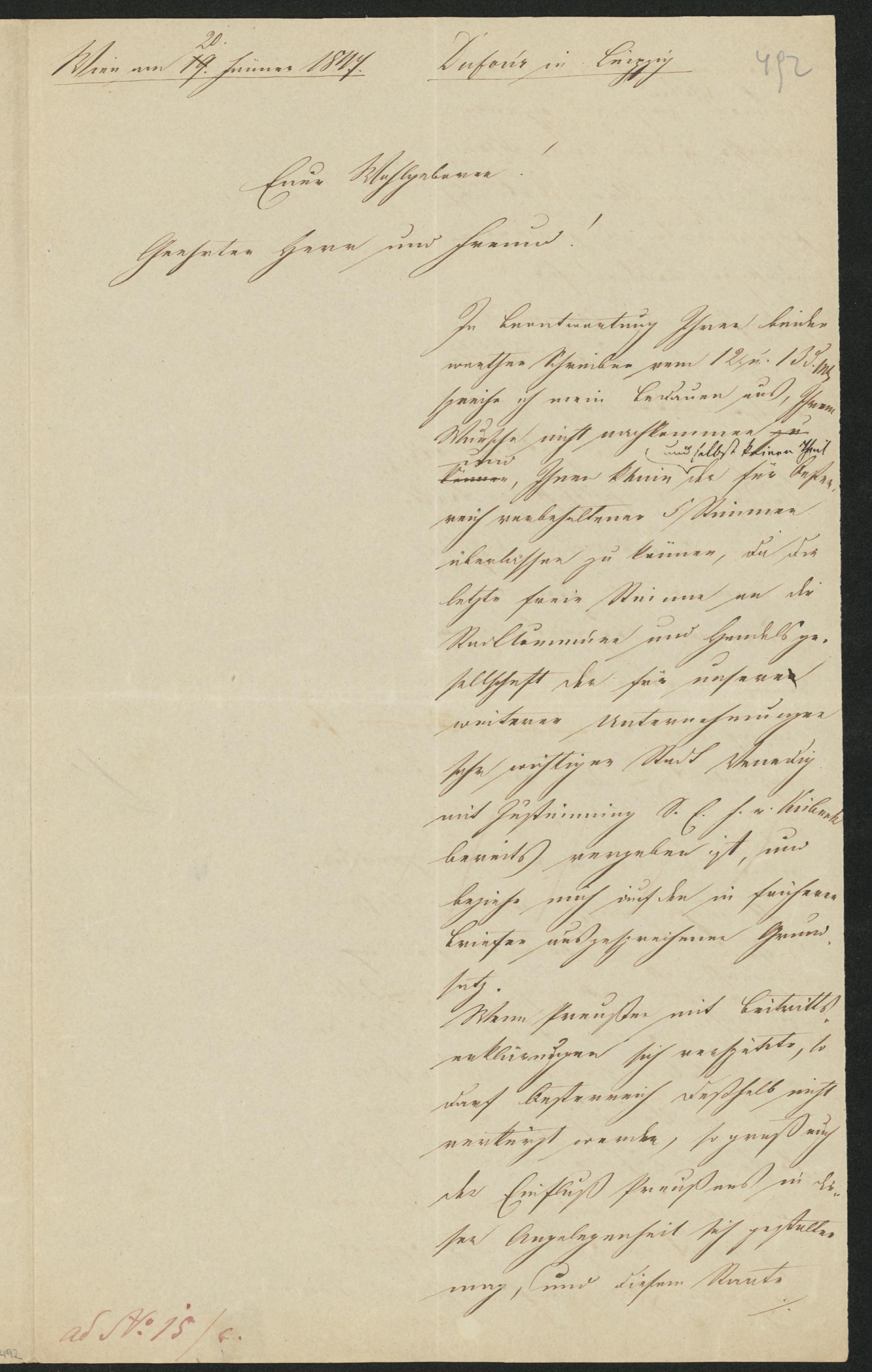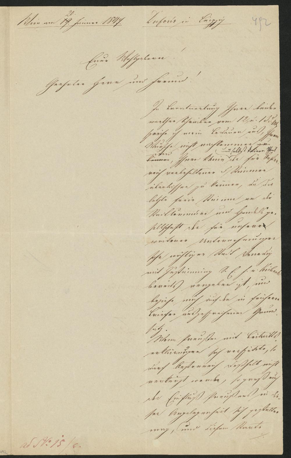 Dufour in LeipzigWien am 19. Januar 1847.Euer Wohlgeboren!Geehrter Herr und Freund!In Beantwortung Ihrer beiderwerthen Schreiben vom 12. u. 13. d. M.spreche ich mein Bedauen aus, IhremWunsche nicht nachkommen zukommen, Ihnen keine und selbst keinen Theil der für Oester¬reich vorbehaltenen 5 Stimmenüberlassen zu können, da dieletzte freie Stimme an dieStadtkammer und Handelsge¬sellschaft der für unsereweiteren Unternehmungensehr wichtige Stadt Venedigmit Zustimmung S. E. F. v. Kübeckbereits vergeben ist, undbeziehe mich auf den in früherenBriefen ausgesprochenen Grund¬satz.Wenn Preußen mit Beitritts-erklärungen sich verspätete, sodarf Oesterreich deßhalb nichtverkürzt werden, so groß auchder Einfluß Preußens in die¬ser Angelegenheit sich gestaltenmag, und diesem Staate