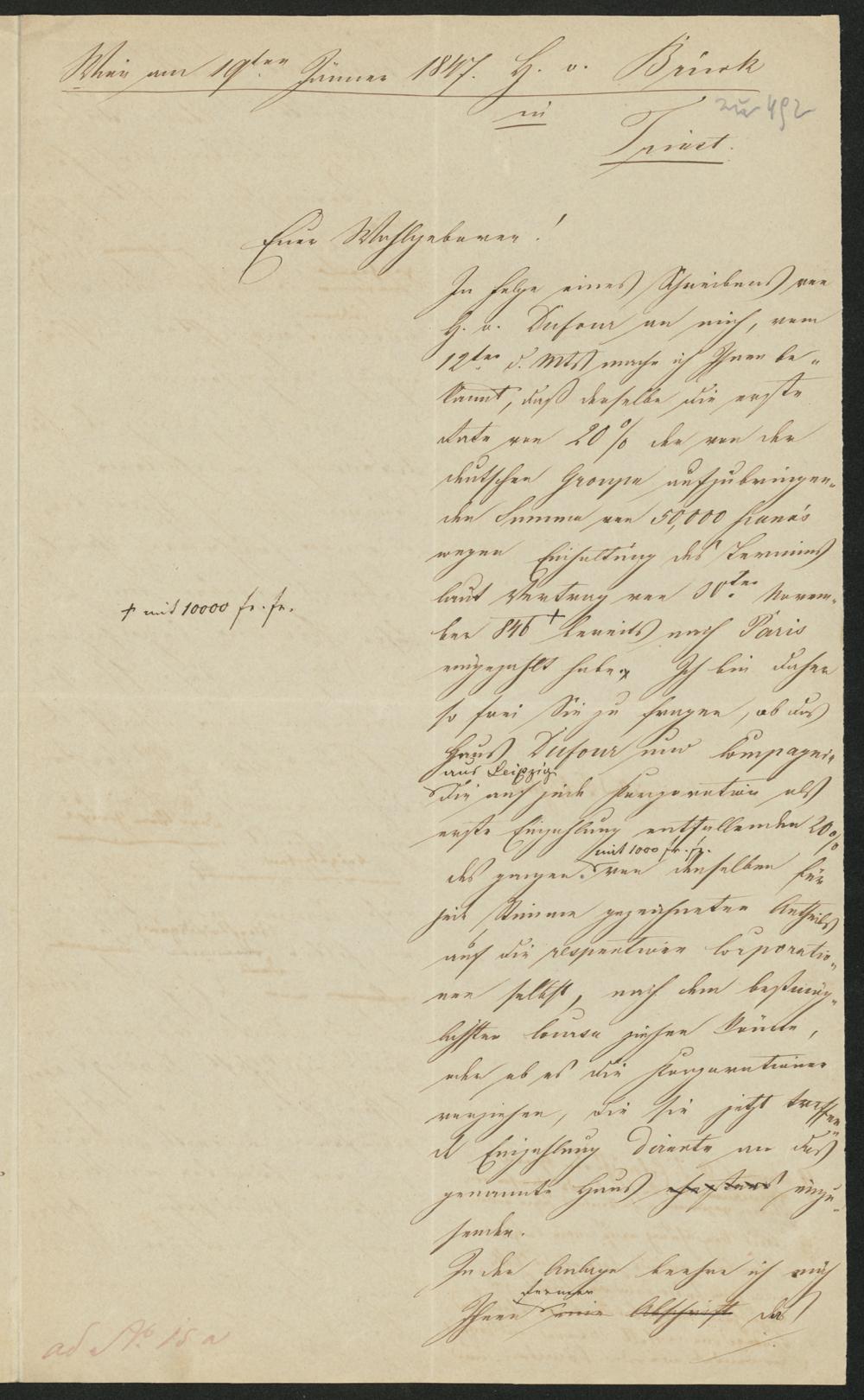 Wien am 19ten Jänner 1847. H. v. BruckinTriestEuer Wohlgeboren!In Folge eines Schreibens vonH. v. Dufour an mich, vom12ten d. Mts. mache ich Ihnen be-kannt, daß derselbe die ersteRate von 20% der von derdeutschen Groupe aufzubringen-den Summe von 50,000 francswegen Einhaltung des Terminslaut Vertrag von 30ten Novem-ber 846 ++ mit 10000 fr. fr.bereits nach Pariseingezahlt habe. Ich bin daherso frei Sie zu fragen, ob dasHaus Dufour und Compagnieaus Leipzigdie auf jede Korporationen alserste Einzahlung entfallenden 20%des ganzenmit 1000 fr. fr.von denselben für[unleserlich] Stimme gezeichneten Antheilsauf die respectiven Corporatio-nen selbst, nach dem [unleserlich][unleserlich] Course ziehen könne,oder ob es die Korporationenverziehen, die sie jetzt treffen-de Einzahlung directe an dasgenannte Haus ehestens einzu-senden.In der Anlage beehre ich michIhnenfernereine Abschrift des