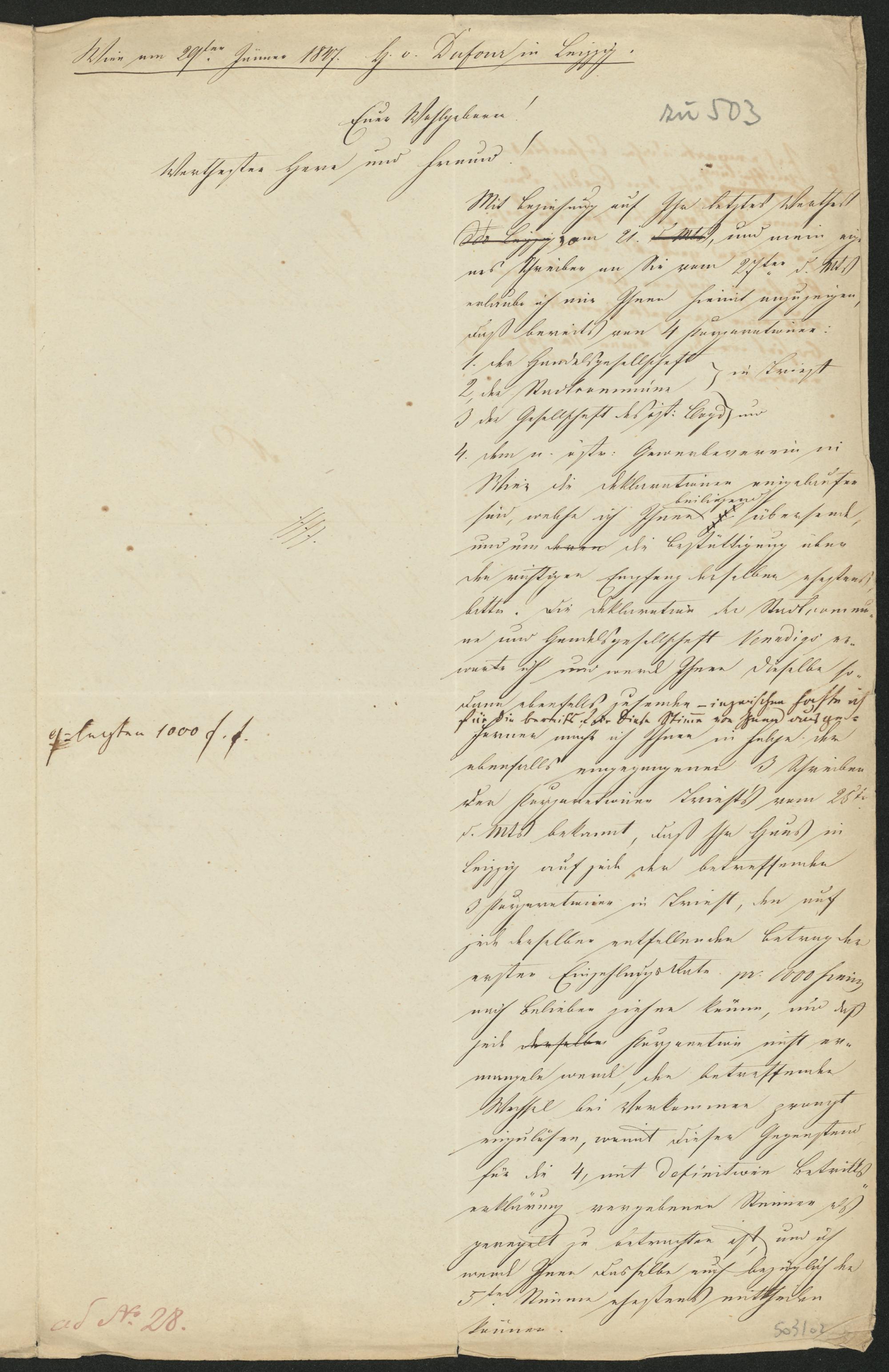Wien am 29.sten Jänner 1847 H. v. Dufour in Leipzig.Euer Wohlgeboren!Werthester Herr und Freund!Mit Beziehung auf Ihr letztes Werthes[?] Leipzig am 21. d. Mts., und mein eig-nes Schreiben an Sie vom 27ten d. Mts.erlaube ich mir Ihnen hiemit anzuzeigen,daß bereits von 4 Korporationen1. der Handelsgesellschaft2, der Stadtcommune in Triest3 der Gesellschaft des k.k. öst: Lloyd und4. dem n. östr. Gewerbeverein inWien die Deklarationen eingelaufenbeiliegendsind, welche ich Ihnens h übersende,und um deren die Bestättigung überden richtigen Empfang derselben ehestens,bitte. Die Deklaration der Stadtcommu-ne und Handelsgesellschaft Venedigs er-warte ich und werde Ihnen dieselbe so-dann ebenfalls zusenden – inzwischen hoffe ichfür die bereits u.[?] diese Stimme von Ihnen ausge-legten 1000 f. f.ferner mache ich Ihnen in Folge derebenfalls eingegangenen 3 Schreibender Korporationen Triests vom 25.ted. Mts bekannt, daß Ihr Haus inLeipzig auf jede der betreffenden3 Korporationen in Triest, den aufjede derselber entfallende Betrag derersten EinzahlungsRate pa. 1000 freynach Belieben ziehen könne, und daßseit derselbeKorporationen nicht er-mangeln werde, der betreffendeWechsel bei Vorkommen prompteinzulösen, womit dieser Gegenstandfür die 4, mit definitiven Betritts-erklärung vergebenen Stimmen alsgeregelt zu betrachten ist, und ichwerd Ihnen dasselbe auch bezüglich der5.ten Stimme ehestents mittheilenkönnen