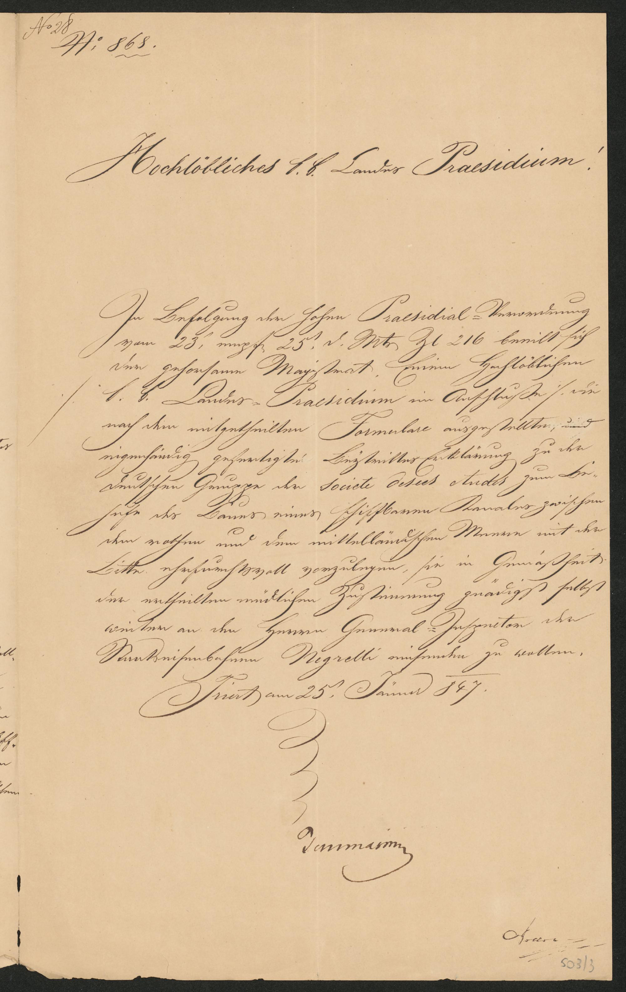 No 28No 868Hochlöbliches k. k. Landes PraesidiumIn Befolgung der hohen Praesidial-Verordnungvom 23[?] 25 d. Mts Zl 216 beeilt sichder gehorsame Magistrat. Einem Hochlöblichenk. k. Landes-Praesidium im Anschluße/ dienach dem mitgetheilten Formulare ausgestellte; undeigenhändig gefertigte Beytrittes Erklärung zu derdeutschen Gruppe der Societe[desees] etudes zum Be-hufe des Baues eines schiffbaren Kanales zwischendem rothen und dem mittelländischen Meere mit derBitte ehrfurchtsvoll vorzulegen, sie in Gemäßheitder ertheilten mündlichen Zustimmung gnädigst selbstwieder an den Herrn General-Inspector derStaatseisenbahnen Negrelli einsenden zu wollen.Triest am 25. Jännr 847[Unterschrift][?]