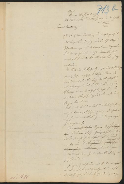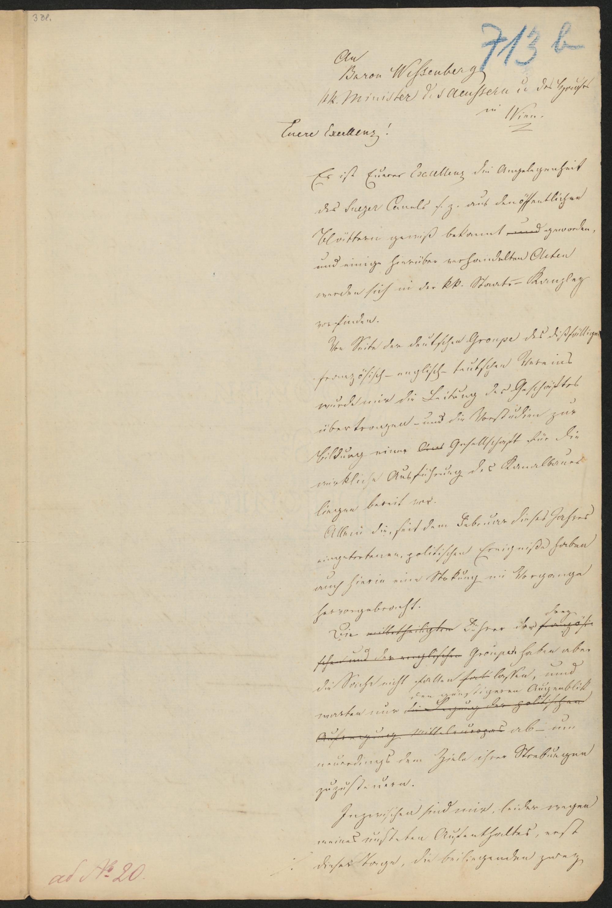 AnBaron Wessenbergkk. Minister des Aeussern u. des [Haupts]in Wien.Euere Excellenz!Es ist Euerer Excellenz die Angelegenheitdes Suezer Canals s. z. aus den öffentlichenBlättern gewiß bekannt und geworden,und einige hierüber verhandelten Actenwerden sich in der kk. Staats-Kanzleyvorfinden.Von Seite der deutschen Groupe des dißfälligenfranzösisch-englisch-teutschen Vereinswurde mir die Leitung des Geschäftesübertragen- und die Vorstudien zurBildung einer An Gesellschaft für diewirkliche Ausführung des Kanalbauesliegen bereit vor.Allein die, seit dem Februar dieses Jahreseingetretenen, politischen Ereigniße habenauch hierin eine Stokung im Vorgangehervorgebracht.Die mitbetheiligten Führer der französidreyschen und der englischen Groupen haben aberdie Sache nicht fallen fort lassen, undwarten nur die Legung der politischenden günstigeren AugenblikAufregung Mitteleuropas ab- umneuerdings dem Ziele ihrer Strebungenzuzusteuern.Inzwischen sind mir, leider wegenmeines unsteten Aufenthaltes, erstdieser Tage, die beiliegenden zwey