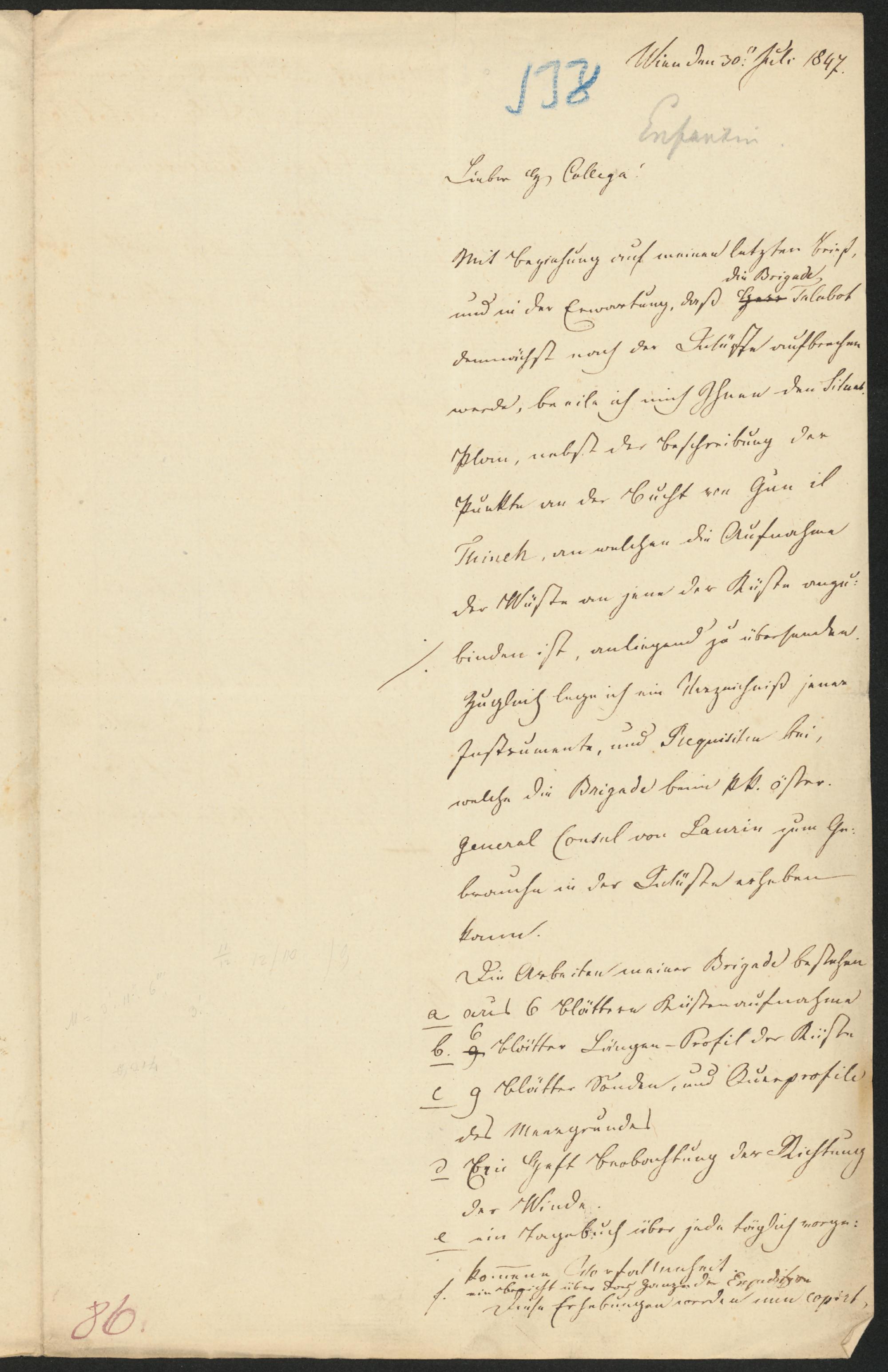 Wien den 30. Jul. 1847.Lieber H. College!Mit Beziehung auf meinen letzten Brief,und in der Erwartung, daßdie BrigadeTalabotdemnächst nach der Wüste aufbrechenwerde, beeile ich mich Ihnen den Situal-plan, nebst der Beschreibung derPunkte an der Bucht von Gun ilThineh, an welchen die Aufnahmeder Wüste an jene der Küste anzu-binden ist, anliegend zu übersenden.Zugleich lege ich ein Verzeichniß jenerInstrumente, und Requisiten bei,welche die Brigade beim kk. öster.General Consul von Laurin zum Ge-brauche in der Wüste erhebenkann.Die Arbeiten meiner Brigade bestehena) aus 6 Blättern Küstenaufnahmeb) 6 Blätter Längen-Profil der Küste c) 9 Blätter Sonden, und Querprofiledes Meergrundes d) Ein Heft Beobachtung der Richtungder Windee) ein Tagebuch über jede täglich vorge-kommene Vorfallenheitf) ein Bericht über das Ganze der ExpeditionDiese Erhebungen werden nun copirt,