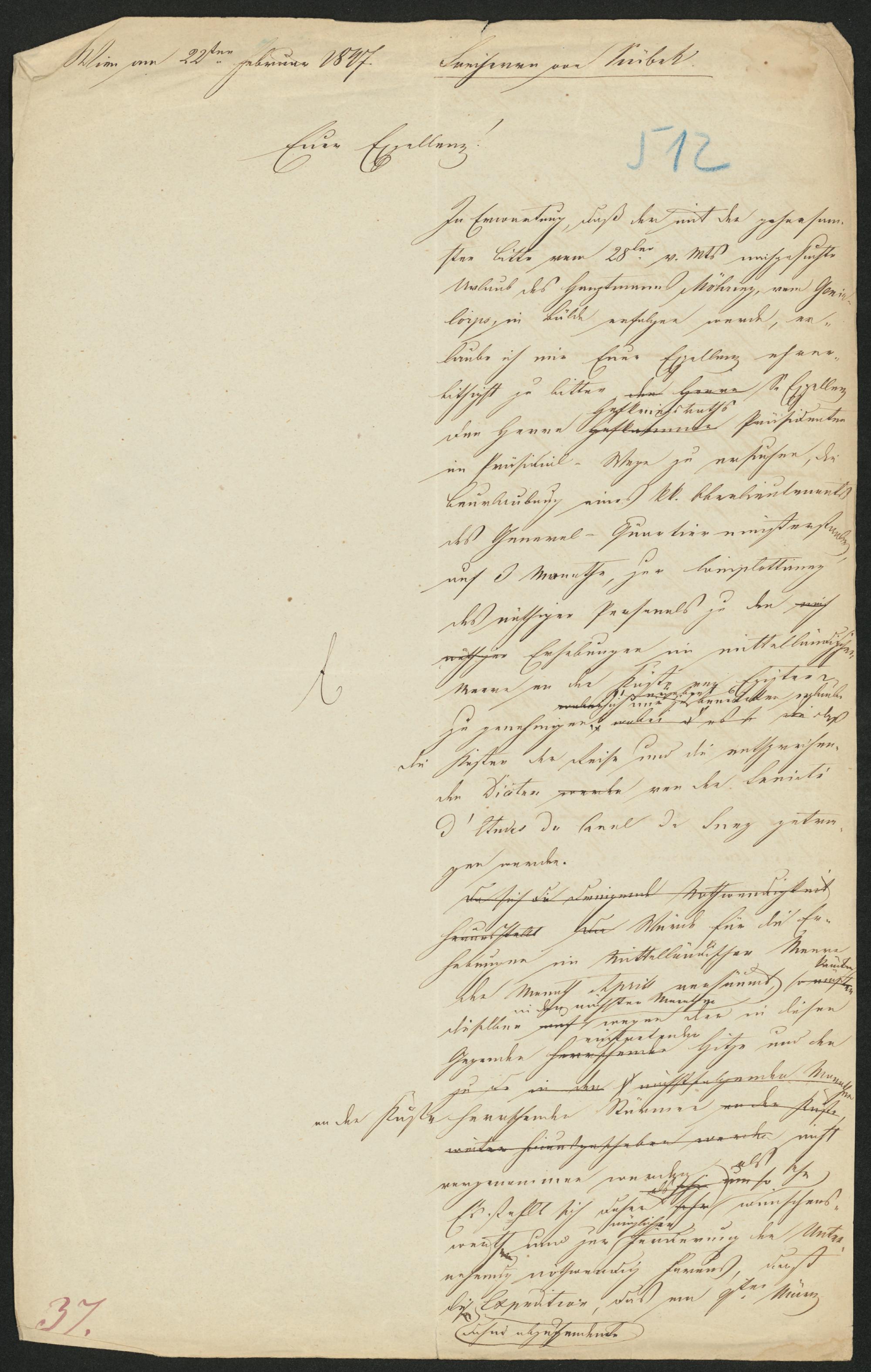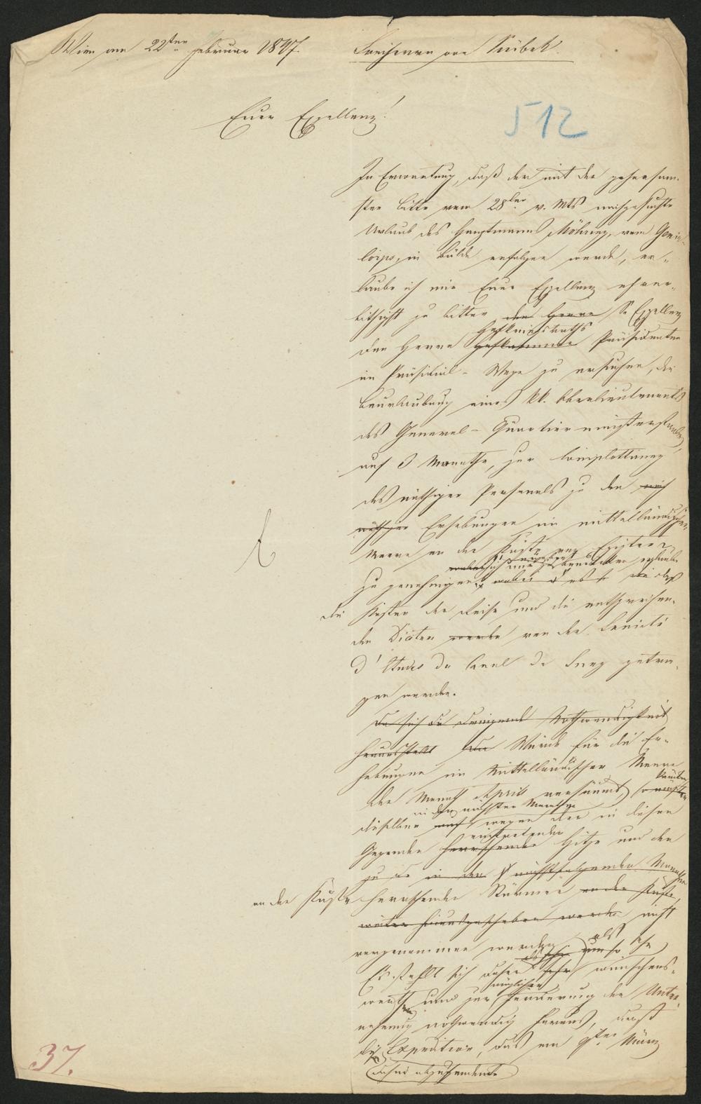 Wien am 22ten Februar 1847Freiherrn von Kübek.Euer Exzellenz!In Erwartung, daß der mit der gehorsam-sten Bitte vom 28ten v. Mts. nachgesuchteUrlaub des Hauptmanns Möhring, vom GenieCorps, in Bülde erfolgen werde, er-laube ich mir Euer Exzellenz ehrer-bithigst zu bitten, den Herrn S. Exzellenzden HerrnHofkriegsrathsPräsidentenim Präsidial-Wege zu ersuchen, dieBeurlaubung eines kk. Oberlieutenantsdes General-Quartiermeister[stabes]auf 3 Monathe, zur Complottirungdes nöthigen Personals zu den nochnöthigen Erhebungen im mittelländischenMeere an der Küste von Egiptenzu genehmigen, [unleserlich]die Kosten der Reise und die entsprechen-den Diäten werden von der Societéd'Etudes du Canal de Suez getra-gen werden.Da sich die [dringende] Nothwendigkeitherausstellt Würde für die Er-hebungen im Mittelländischen Meereder Monath April versäumt, so könntedieselbenin den nächsten Monathewegen der in dieserGegende herrschendeeintretendeHitze und deran der Küste herrschende Stürmenichtvorgenommen werden.Es stellt sich daher sehr wünschens-werth und zurmöglichenFörderung der Unter-nehmung nothwendig heraus, daßdie daher abzusendende Expedition, daß am 9ten März