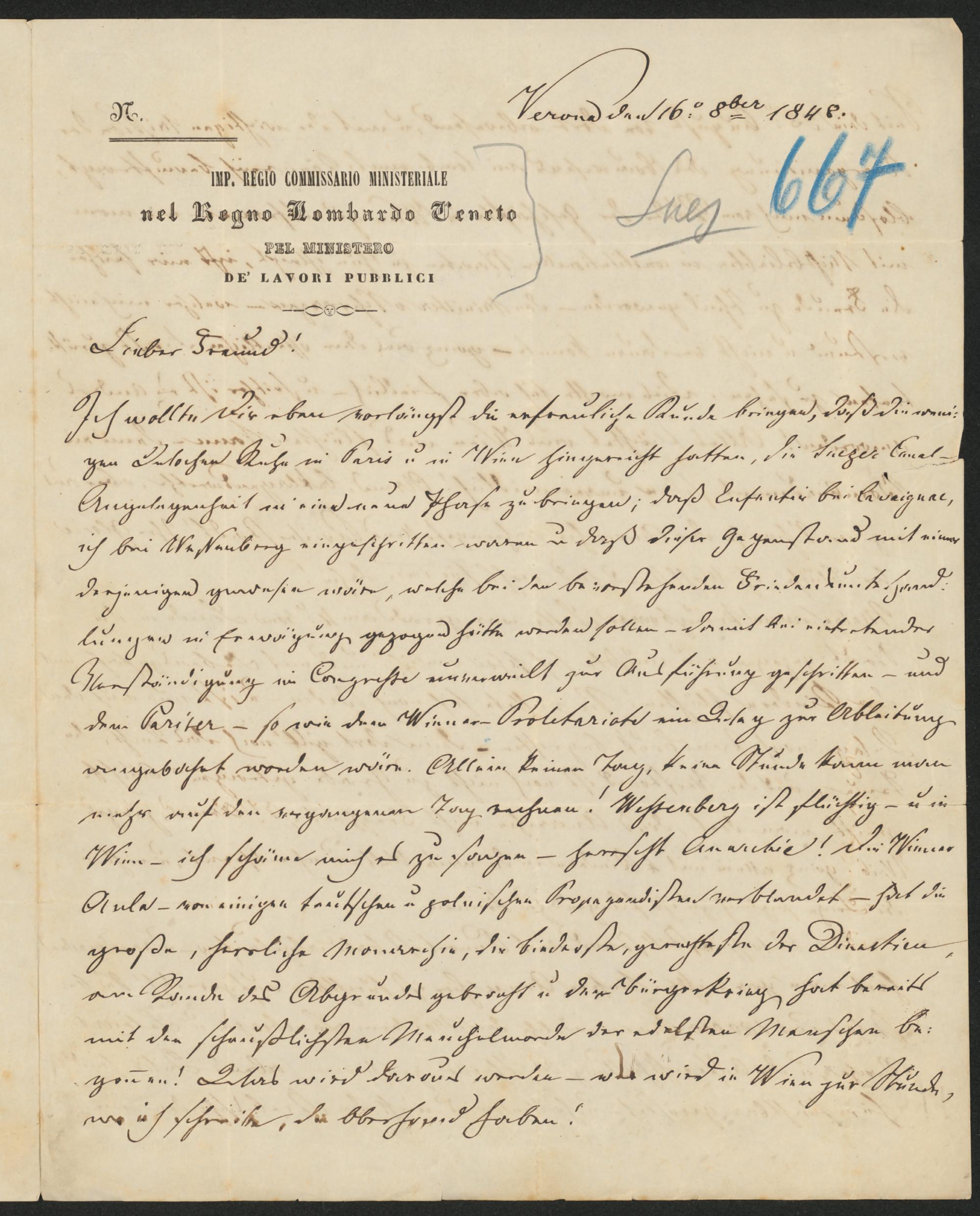 Verona den 16. 8ber 1848.Lieber Freund!Ich wollte Dir eben vorlängst die erfreuliche Kunde bringen, daß die weni¬gen Wochen Ruhe in Paris u. in Wien hingereicht hatten, die Suezer Canal-¬Angelegenheit in eine neue Phase zu bringen; daß Enfantin bei Cavaignac,ich bei Wessenberg eingeschritten waren u. daß dieser Gegenstand mit einerderjenigen gewesen wäre, welche bei den bevorstehenden [Friedensaushand¬lungen] in Erwägung gezogen hätte werden sollen- damit bei eintretenderVerständigung im Congresse unverweilt zur Ausführung geschritten- unddem Pariser- so wie dem Wiener- Proletariate ein Weg zur Ableitungangebohrt worden wäre. Allein keinen Tag, keine Stunde kann manmehr auf den vergangenen Tag rechnen! Wessenberg ist flüchtig- u. inWien- ich schäme mich es zu sagen- herrscht Anarchie! Die WienerAula- von einigen teutschen u. polnischen Propagandisten verblendet- hat diegroße, herrliche Monarchie, die biederste, gerechteste der [Direction]am Rande des Abgrundes gebracht u. der Bürgerkrieg hat bereitsmit den scheußlichsten Meuchelmorde der edelsten Menschen be-gonnen! Was wird daraus werden— wer wird in Wien zur Stunde,wo ich schreibe, die Oberhand haben!