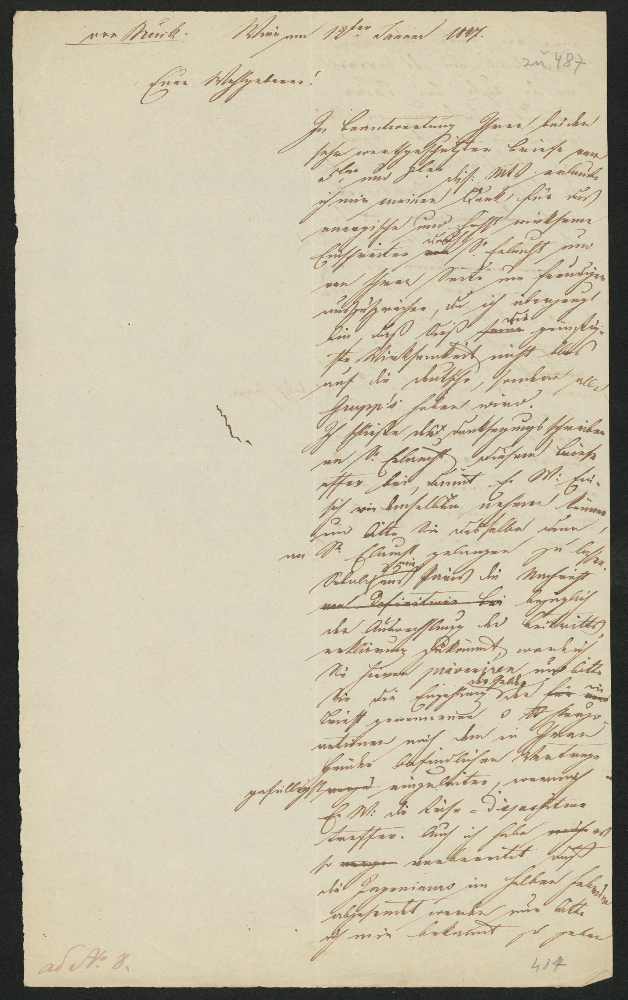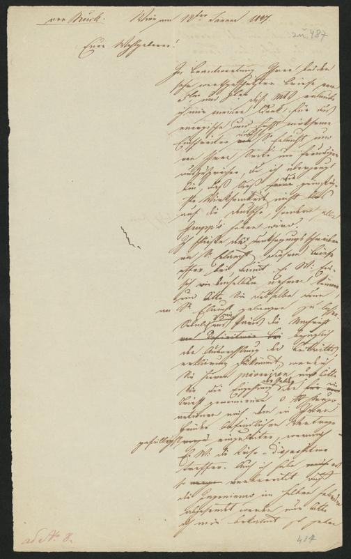 von Bruck.Wien am 12ten Janner 1847.Euer Wohlgeboren!In Beantwortung Ihrer bei densehr werthgeschätzten Briefe vom5ten und 8ten dis. Mts erlaubteich mir meinen Dank für dasenergische und höchst wirksameEinschreiten vondurchS(einer) Erlaucht umvon Ihrer Seite um freudigerauszusprechen, da ich überzeugtbin, daß dies seine die günstig-ste Wirksamkeit nicht blosauf die deutsche, sondern allenGrupp's haben wird.Ich schließe das Danksagungsschreibenan S(eine) Erlaucht diesem Briefeoffen bei, damit E. W. Einsich wie demselben nehmen könnenum bitte Sie dasselbe dannan S(eine) Erlaucht gelangen zu lassen.Sobald mir aus Paris die Nachrichtvon Deficitionn Bei bezüglichder Auswechslung der Beitritts-erklärung zukömmt, werde ichSie hievon präveniren und bitteSie die Einzahlungder Gelderder für wir inBericht gewonnenen 3 t Korpo-rationen nach dem in IhrenHänden befindlichen Vertragegefälligst wegen einzuleiten, wornachE. W. die Reise- Dispositiontreffen. Auch ich habe esso rengen vorbereitet, daßdie Ingenieurs im halben Februarabgesendet werden nur bitteich mir bekannt zu geben