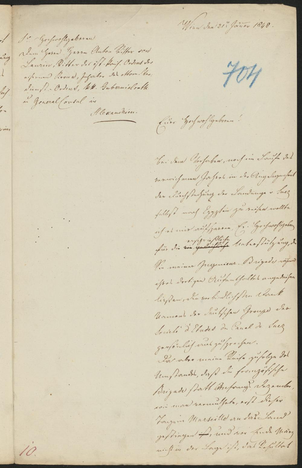 Wien den 21t. Jäner 1848.Euer Hochwohlgeboren!Bei dem Vorhaben, noch im Laufe desverwichenen Jahres in der Angelegenheitder Durchstechung der Landenge v. Suezselbst nach Egypten zu reisen wollteich es mir aufsparren, Er. Hochwohlgeborenersprießlichefür die wie gedeihliche Unterstützung, dieSie meiner Ingenieur-Brigade währendihres dortigen Aufenthaltes angedeihenließen, den verbindlichsten DankNamens der deutschen Groupe derSociete d'Etudes du Canal de Suezpersönlich auszusprechen.Da aber meine Reise zufolge desUmstandes, daß die französischeBrigade statt Anfangs Dezember,wie man vermuthete, erst dieserTage in Marseille an das Landgestiegen ist, und vor Ende Märznicht in der Lage ist, das Resultat