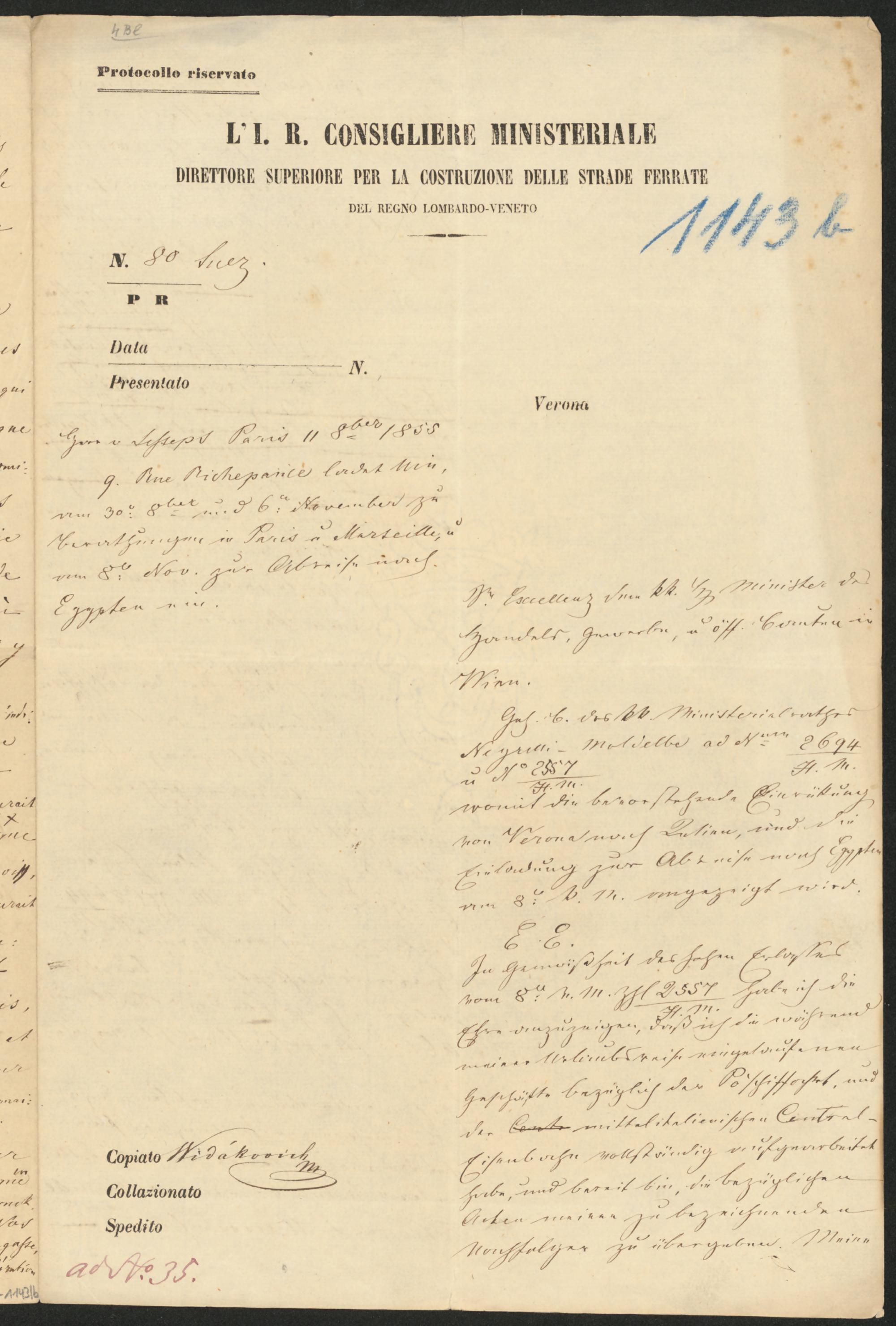 Protocollo riservatoL'I. R. CONSIGLIERE MINISTERIALEDIRETTORE SUPERIORE PER LA COSTRUZIONE DELLE STRADE FERRATEDEL REGNO LOMBARDO-VENETON. 80 SuezPRDataPresentatoN.VeronaHerr v. Lesseps Paris 11 8ber 1855.9. Rue Richepance ladet ein,am 30t 8ber und 6. November zuBerathungen in Paris u Marseille, u.am 8te Nov. zur Abreise nach.Egypten ein.Sr Excellenz dem kk. H. Minister desHandels, Gewerbe, u öff. Bauten inWien.Ges. b. des kk. MinisterialrathesNegrelli- Moldelbe ad Num.2694H. M.u. No 2557H. M.womit die bevorstehende Einrückungvon Verona nach Wien, und dieEinladung zur Abreise nach Egyptenam 8. k. M. angezeigt wird.E. E.In Gemäßheit des hohen Erlassesvom 8te v. M. Zhl. 2557/ H. M.habe ich dieEhre anzuzeigen, daß ich die währendmeiner Urlaubsreise eingelaufenenGeschäfte bezüglich der Poschiffahrt, undder mittelitalienischen Central-Eisenbahn vollständig aufgearbeitethabe, und bereit bin, die bezüglichenActen meinen zu bezeichnendenNachfolger zu übergeben. Meinecopiato Widakovich mpCollazionatoSpedito