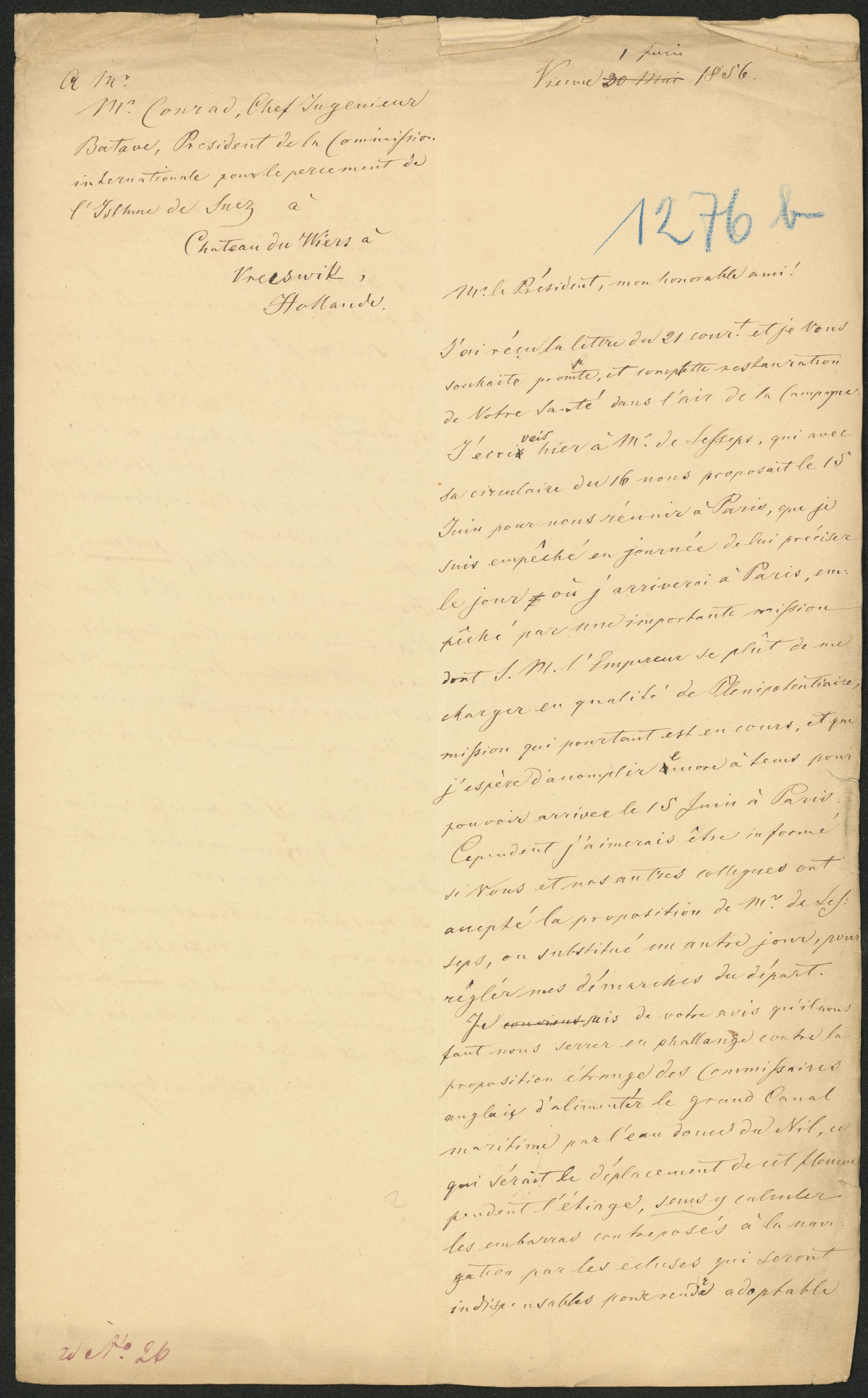 Vienne 20 mar 1 Juin 1856.M(onsieu)r le Président, mon honorable ami!J’ai réçu la lettre du 21 cour(an)t et je voussouhaite prompte, et complette restaurationde Votre santé dans l’air de la CompagnieJ'écrivais hier à M(onsieu)r de Lesseps, qui avecsa circulaire du 16 nous proposait le 15Juin pour nous réunir à Paris, que jesuis empêché en journée de lui préciserle jour où j’arriverai à Paris em-pêché par une importante missiondont S(a) M(ajesté) l'Empereur se plût de mecharger en qualité de Plenipotentiaire,mission qui pourtant est en cours, et quel’espère d’accomplir encore à tem[p]s pourpouvoir arriver le 15 Juin à Paris.Cependent j’aimerais être informéde Vous et nos autres collegues ontaccepté la proposition de M(onsieu)r de Les-seps, ou substitué un autre jour, pourrégler mes démarches du départ.Je conviens sais de votre avis qu'il nousfaut nous serrer en phallange contre laproposition étrange des commissairesanglais d’alimenter le grand Canalmaritime par l’eau douce du Nil, cequi serait le déplacement de cet fleuvependant l’étiage, sans y calculerles embarras contreposés à la navi-gation par les écluses qui serontindispensables pour rendre adoptable