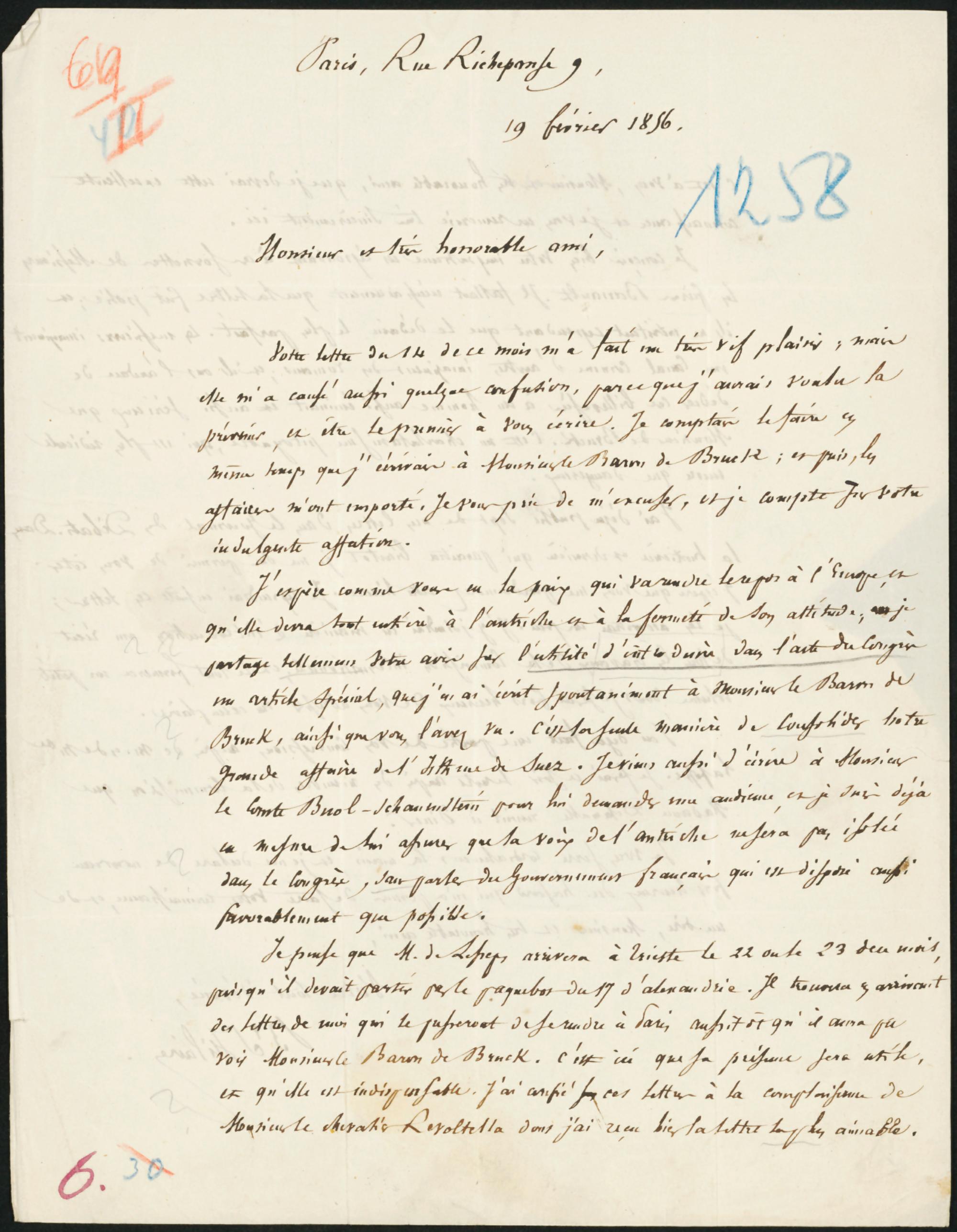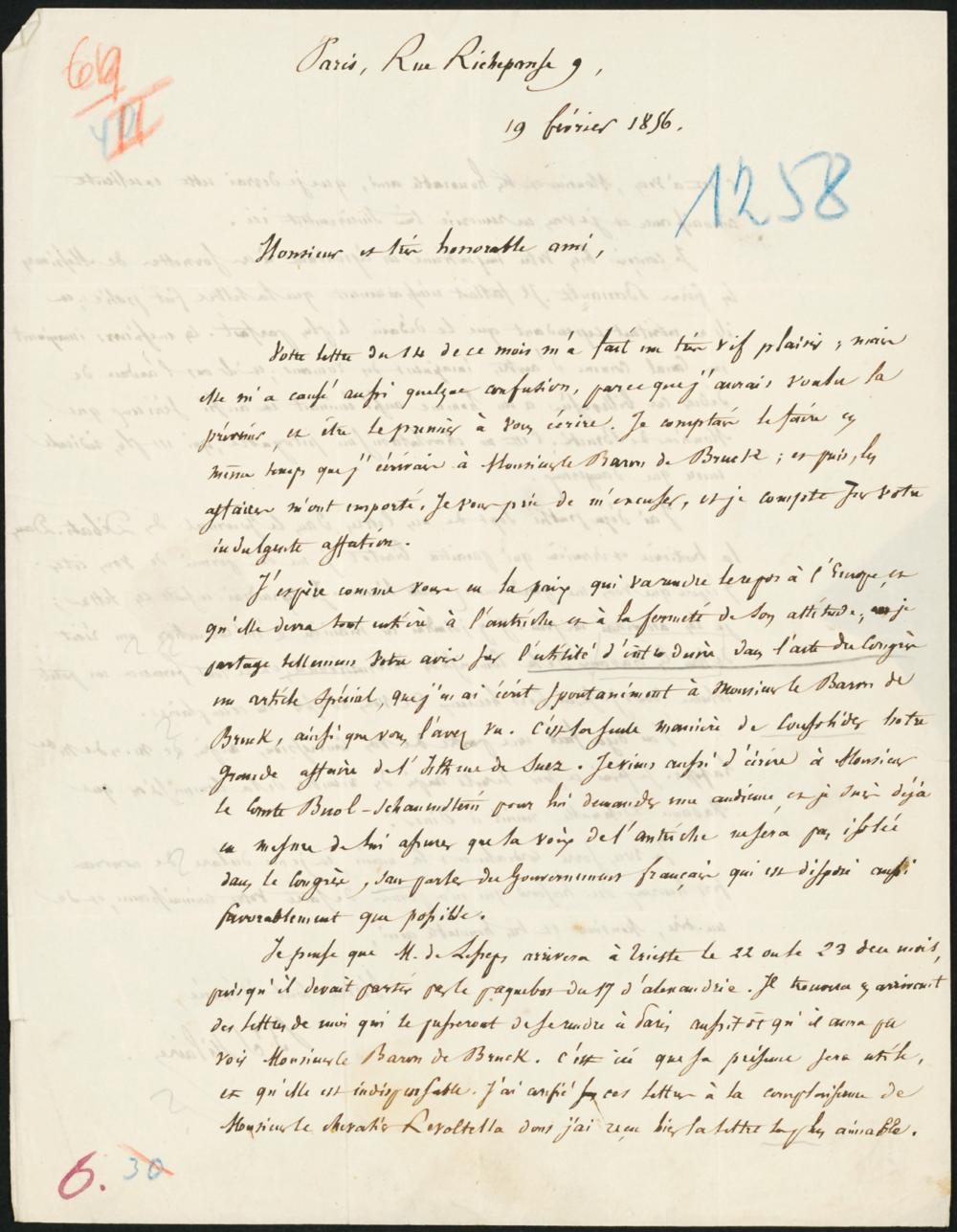 Paris, Rue Richepance 9,19 février 1856.Monsieur et très honorable ami,Votre lettre du 14 de ce mois m'a fait un très vif plaisir, maiselle m'a causé aussi quelque confusion, parce que j'aurais voulu laprévenir, et être le premier à vous écrire. Je comptais le faire cymême temps que j'écrirais à Monsieur le Baron de Bruck; et puis, lesaffaires m'ont emporté. Je vous prie de m'excuser, et je compte sur votreindulgente affection.J'espère comme vous en la paix qui va rendre le repos à l'Europe, etqu'elle devra tout entière à l'Autriche et à la fermeté de son attitude, jepartage tellement votre avis sur l'utilité d'introduire dans l'acte du Congrèsun article spécial, que j'en ai écrit spontanément à Monsieur le Baron deBruck, ainsi que vous l'avez vu. C'est la seule manière de consolider notregrande affaire de l'Isthme de Suez. Je viens aussi d'écrire à Monsieurle Comte Buol-Schauenstein pour lui demander une andience et je suis déjàen mesmee de lui assurer que la voix de l’Autriche ne sera pas isoléedans le Congrès, san parler du Gouvernement français qui est disposé aussifavorablement que possible.Je pense que M(onsieu)r de Lesseps arrivera à Trieste le 22 ou le 23 de ce moispuisqu'il devait partir par le paquebot du 17 d'Alexandrie. Il trouvera en arrivantdes lettres de moi qui le passeront de se rendre à Paris aussitôt qu'il aura puvoir Monsieur le Baron de Bruck. C'est ici que sa présence sera utile,et qu'elle est indispensable. J'ai [censié] ses ces lettres à la complaisance deMonsieur le chevalier Revoltella dont j'ai reçu bien sa lettre la plus aimable.