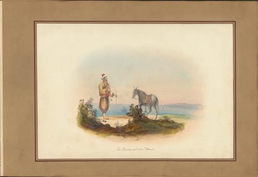 "Ein Dalmatiner-Bauer"Dalmatien war seit dem Wiener Kongress 1815 ein Kronland der Habsburgermonarchie. Aufgrund der Nähe zu osmanisch beherrschten Gebieten und des kulturellen Austauschs war der Einfluss der Osmanen in vielfältiger Hinsicht (so auch in der Kleidung) deutlich spürbar.Die Komposition des Aquarells erinnert an ein „Guckkastenbild“ eine optisch gerahmte Darstellung mit abgerundeten Konturen, die den Eindruck eines Blicks durch ein Fernglas vermittelt. Die malerisch-zeichnerische Gestaltung spiegelt Junkers akademische Ausbildung am Wiener k. k. Polytechnischen Institut wider, an dem ein traditioneller zeichnerischer Kanon vermittelt wurde. Sowohl Aufbau als auch Farbgestaltung orientieren sich an der Tradition der Wiener Landschaftsmaler jener Zeit.Mann und Esel/Maultier sind zentral positioniert, was ihre Wichtigkeit in der Komposition hervorhebt. Die Darstellung der regionaltypischen Kleidung folgt kolonial geprägten Klischees des ‚orientalischen Bauern‘, Glossar ::: zum Glossareintrag  Bauern‘, etwa durch Fez, Glossar ::: zum Glossareintrag  Fez, Pluderhose, lange Pfeife, und verweist damit auf ein seinerzeit geläufiges Bildschema der „Volkstrachten“ aus dem östlichen Mittelmeerraum und dem Osmanischen Kulturkreis.Der vergleichsweise hoch angesetzte Horizont ist ein charakteristisches Gestaltungselement: Die Lichtführung sowie die feine Abstufung der Blautöne schaffen eine gezielte Tiefenwirkung, welche den Blick der Betrachtenden auf das zentrale Bildmotiv lenkt.