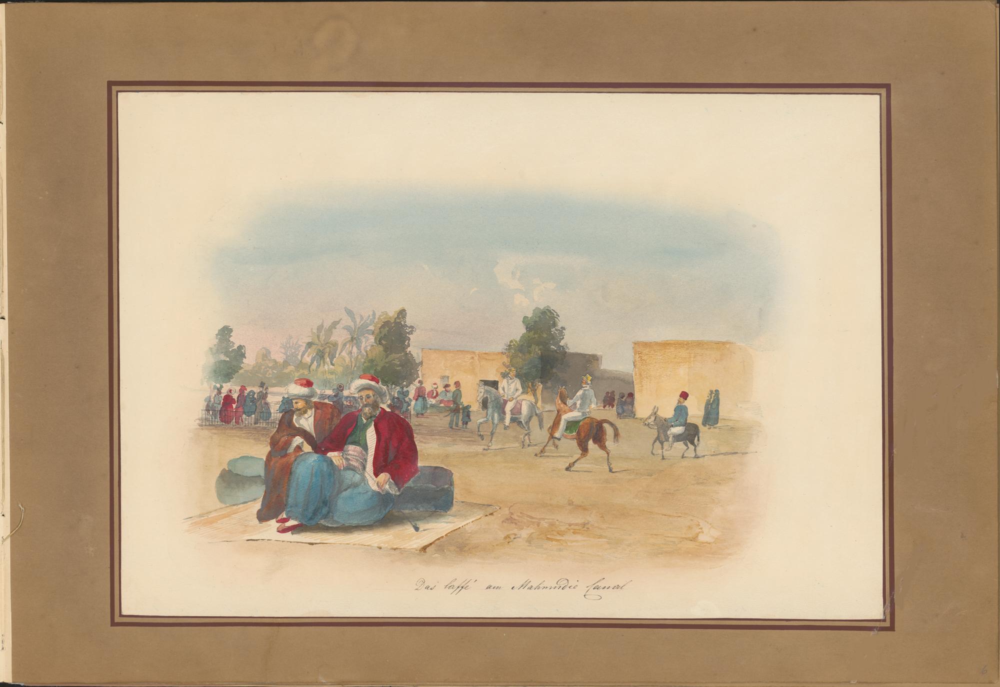 "Das Caffé am Mahmudie Canal" Die Komposition wirkt wie eine Momentaufnahme und vermittelt eine vermeintlich authentische Alltagssituation, wie sie in Darstellungen des aus dem 19. Jahrhundert häufig inszeniert wird.Im Vordergrund sitzen zwei Ägypter mit Fez Glossar ::: zum Glossareintrag  Fez entspannt auf einem Teppich und rauchen Pfeife.Das rechts im Bild dargestellte Ensemble reitender Personen zeigt Europäer zu Pferd und einen Ägypter auf einem Maultier. Diese Komposition reflektiert auf subtile Weise eine koloniale und sozialhierarchische Bildsprache.Im hinteren Bereich der Darstellung sind verschiedene Personen zu sehen, darunter Frauen und Männer, die sowohl westliche als auch arabisch-islamische Kleidung tragen. Dies unterstreicht das internationale Treiben in der Hafenstadt Alexandria und ihrer Umgebung.
