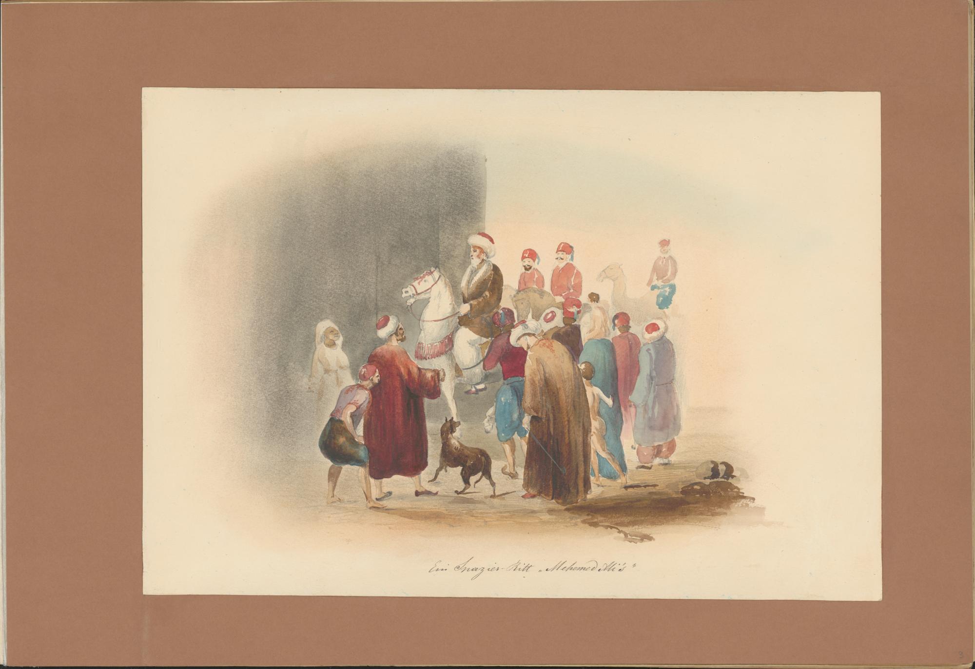 "Ein Spazier-Ritt 'Mehemed Ali's' "Die Komposition entspricht dem typischen Bildschema eines Einzugs oder Umzugs.Im Zentrum der Darstellung reitet der Vizekönig Mehmed Ali auf einem edlen Schimmel – ein klassisches Zeichen für Status und Macht, gefolgt von einer Begleitmannschaft auf Kamelen. Die Komposition ist skizzenhaft gehalten und verliert nach außen hin zunehmend an Detail, was den Eindruck einer flüchtigen Momentaufnahme verstärkt.Die Szene spielt sich auf einer belebten Straße ab, die durch kleine Akzente wie den Hund im Vordergrund lebendig wirkt. Solche Details verleihen dem Bild Dynamik und verankern das Umzugs-Sujet im Alltagsgeschehen.