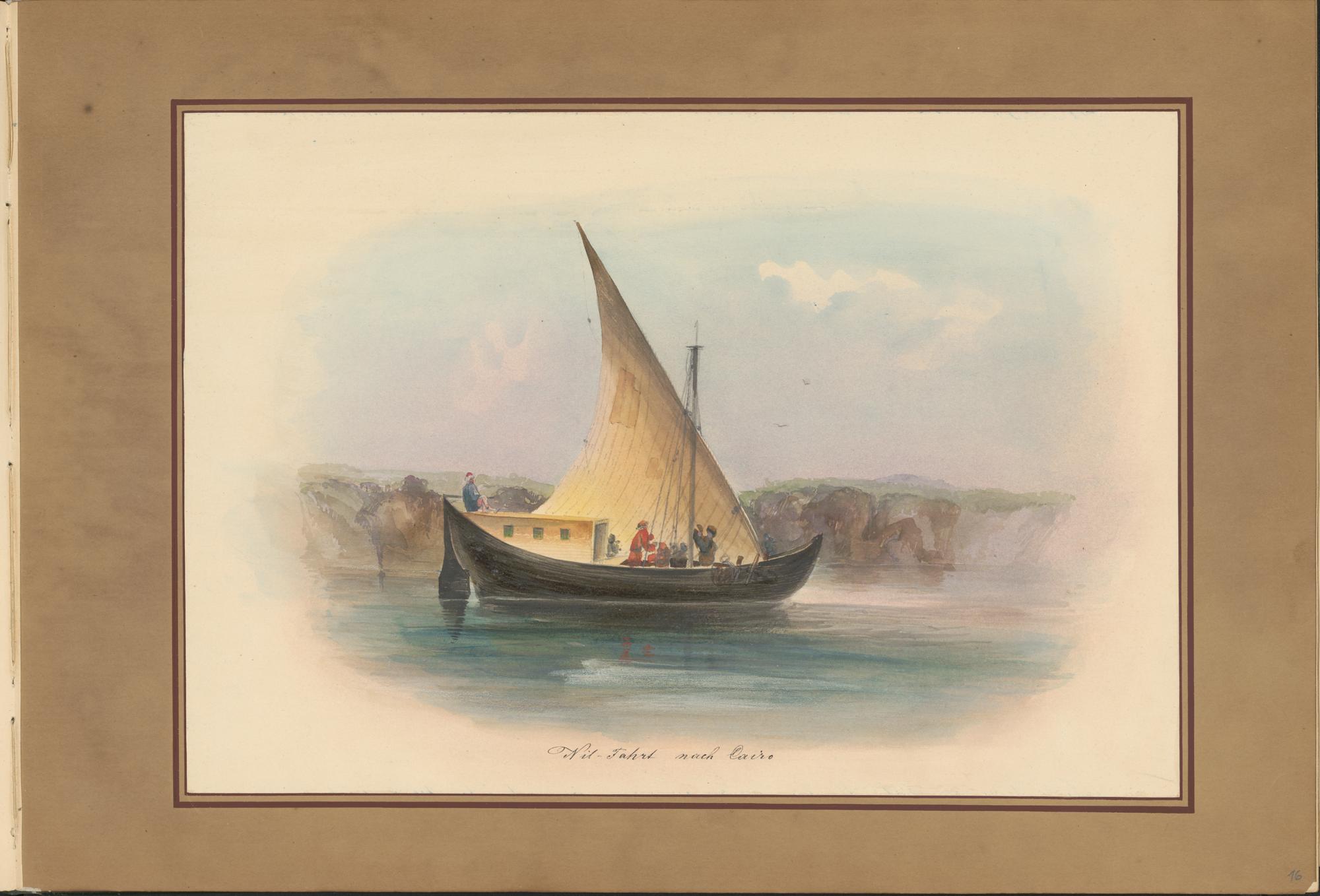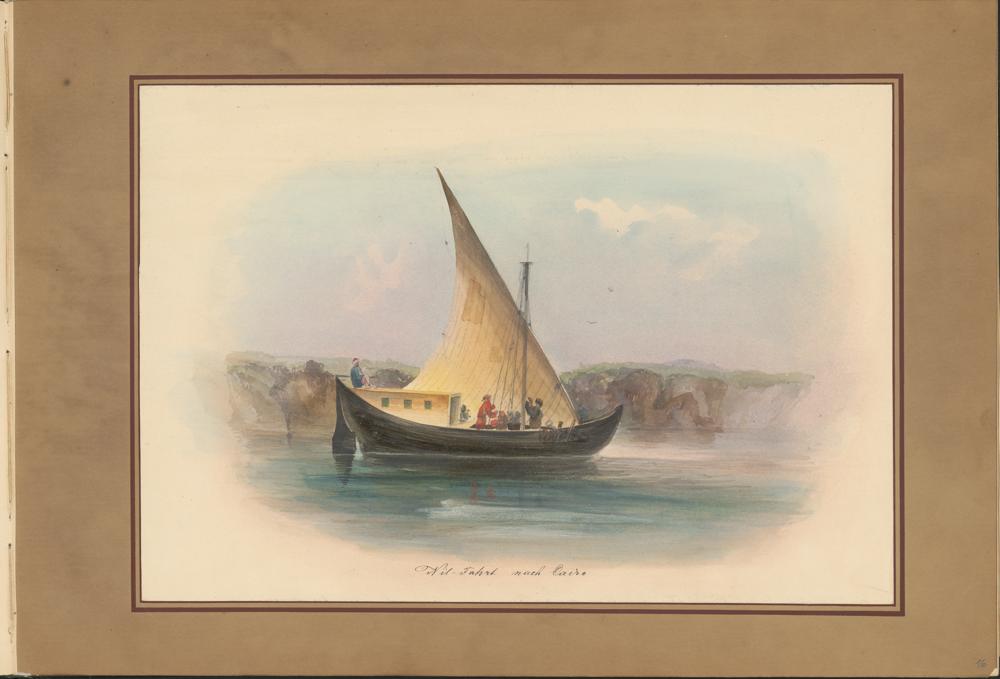 "Man kann sich unser Unwillen vorstellen als in ganz Damiatte keine Miethpferde aufgetrieben werden konnten und wir mit großen Suchen und vielen Bitten für immenses Geld eine schmutzige Nilbarke bekammen, mit der wir unsere Reise antretten konnten.- […] Des andern Morgens war das ein göttliches Erwachen: dieser Duft der Felder, das Singen der Vögel kurz die reitzenden Nilufer werde ich nie vergessen.- Wir kammen vor einer Menge von Plantagen vorbey, und bewunderten die Agricultur dieses Landes, die in Nichts anderem als Wasserschöpfen besteht.- Man sieht daher längst der Nilufern viele Wasserräder die durch Ochsen, Kamehle oder Pferde getrieben werden, und welche sich in BewässerungsCanäle ergießen.- Besonders schön sind die Abende, wenn so die Hitze des Tages mit einer angenehmen Kühle wechselt, der Mond die zerstreuten Lehmhütten und Palmen der Dörfer beleuchtet, so kann man sich keine schönere und angenehmere Reise wünschen. […] Eine andere Unannehmlichkeit war der schlechte Wind oder die Windstille die uns oft heimsuchte.- War dieß der Fall,- so mußten unsere Matrosen das Schiff, wie bey uns hier die Schiffspferde ziehen.- Da kein ordentlicher Herd war, so bekammen wir auch nichts Gutes zu essen, und wenn ich trinken wollte, so schöpfte ich nur das Wasser aus den Nil, was denn doch auch ge¬rade nicht am appetitlichsten war, indem immer