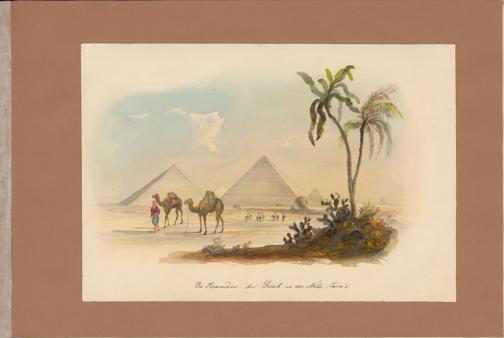 "Die Piramiden bei Gizeh in der Nähe Cairo's" Die Darstellung der großen Pyramiden, die der gebildeten Bevölkerungsschichten in Europa in vermutlich seit der napoleonischen Zeit durch Werke wie „Description de l’Égypte“ bekannt ist, prägt den Charakter des Bildes. Dabei nimmt die Cheops-Pyramide als wichtigste Pyramide die zentrale Position ein.Links vor der Cheops-Pyramide ist der Kopf der großen Sphinx angedeutet.Unterhalb der Pyramide, zentral im Bild, erscheinen die in Weiß gekleideten Mitglieder der österreichischen Expedition als winziges Detail ein stilistisches Mittel, das die monumentale Größe des Bauwerks eindrucksvoll unterstreicht.Palmen und Kakteen verleihen der Szene einen exotisch wirkenden Charakter. Allerdings sind Kakteen keine Pflanzen, die in der ägyptischen Wüste heimisch sind. Da sie ursprünglich aus Nord-, Mittel- und Südamerika stammen, deutet ihre Präsenz auf eine ikonografische Vermischung hin. Es ist möglich, dass Carl Junker sich bei der Darstellung von Wüstenpflanzen von Illustrationen aus der „Neuen Welt“ inspirieren ließ.