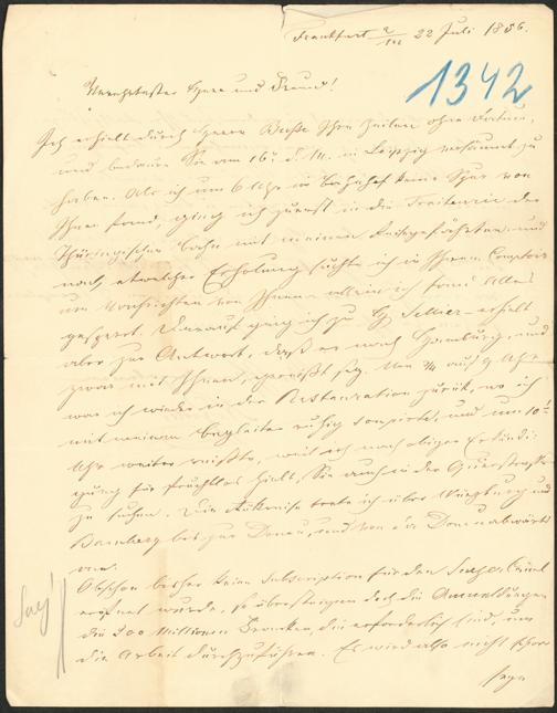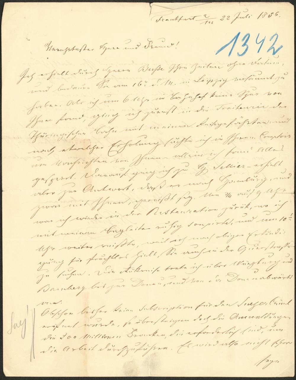 Frankfurt a/M. 22 Juli 1856.Verehrtester Herr und FremdIch erhielt durch Herrn Busse Ihre Zeilen ohne Datum,und bedauere Sie am 16. d. M. in Leipzig versäumt zuhaben. Als ich um 6 Uhr im Bahnhof keine Spur vonIhnen fand, ging ich zuerst in die [Traiteurie] derThüringischen Bahn mit meinen Reisegefährten undnach etwelcher Erholung suchte ich in Ihrem Comptoirum Nachrichten von Ihnen - allein ich fand Allesgesperrt. Darauf ging ich zu H. Sellier- erhieltaber zur Antwort, daß er nach Hamburg, undzwar mit Ihnen, gereist sey. Um 3/4 nach 9 Uhrwar ich wieder in der Restauration zurük, wo ichmit meinen Begleitern ruhig soupirte, und um 10 1/2Uhr weiter reißte, weil ich nach obiger Erkundi-gung für fruchtlos hielt. Sie auch in der Querstraßezu suchen. Die Rükreise trete ich über Würzburg undBamberg bis zur Donau, und von da Donauabwärtsan.Obschon bisher keine Subscription für den Suezer Canaleröfnet wurde, so übersteigen doch die Anmeldungendie 200 Millionen Franken, die erforderlich sind, umdie Arbeit durchzuführen. Es wird also nicht schonseyn