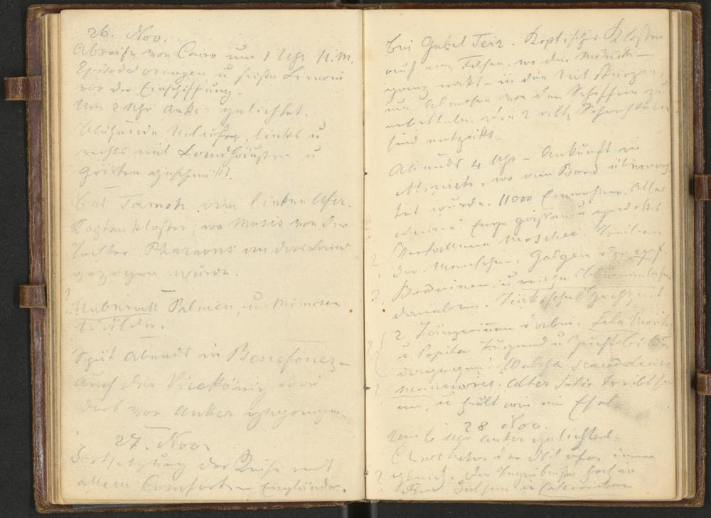 26. Nov(ember)Abreise von Cairo um 1 Uhr N(ach) M(ittag)Episode Orangen u(nd) süße Limonivor der Einschiffung.Um 2 Uhr Anker gelichtet.Blühende Nilufer links u(nd)rechts mit Landhäuser u(nd)Gärten geschmückt.Bei Tamoh am linken UferKoptenkloster1, wo Moses von derTochter des Pharaons an das Landgezogen wurde.Ueberall Palmen, u(nd) MimosenWälder.Spät Abends in Benefairez-Auch der Vicekönig wardort vor Anker gegangen.27. Nov(ember)Fortsetzung der Reise mitallem Comfort der— Engländer.
