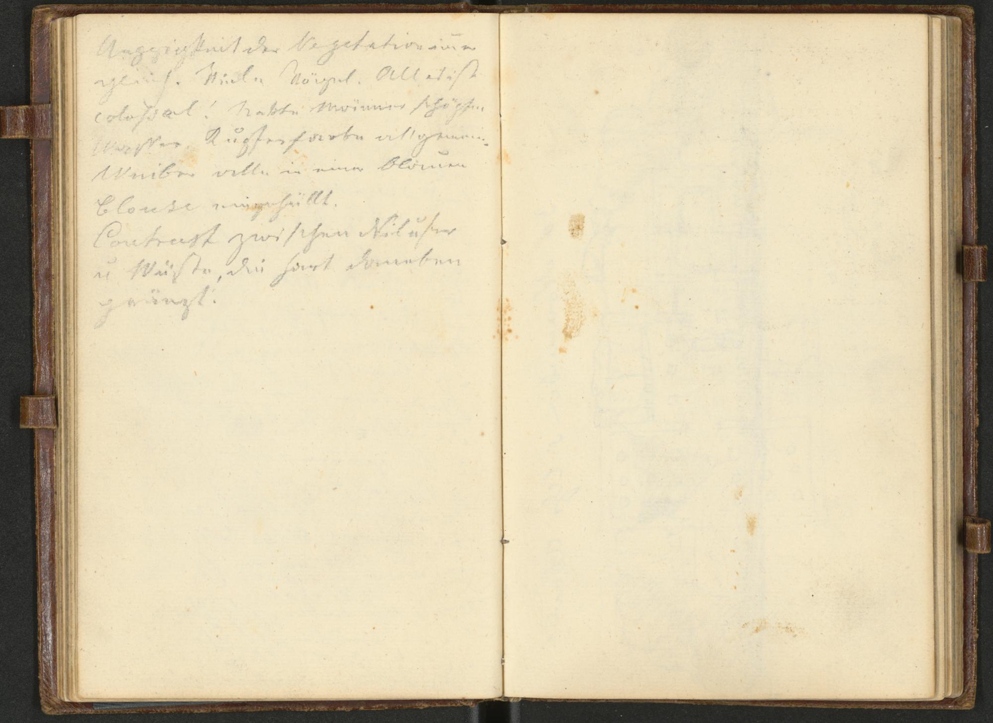 Ueppigkeit der Vegetation immergleich. Viele Vögel. Alles istcolossal! Nakte Männer schöpfenWasser. Kupferfarbe allgemein.Weiber alle in einer blauenBlouse eingehüllt.Contrast zwischen Nilufer u(nd) Wüste , die hart danebengränzt.
