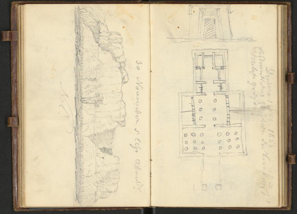 Auf dieser Bleistiftskizze von Negrelli vom 1. Dezember 1855 ist der Plan des Tempels von Dendera sowie eine Zeichnung des Pylons (Eingangsbereich) zu sehen. Ein solcher Plan war bereits zur Zeit von Negrellis Besuch in der Description de l'Égypte (1817) veröffentlicht worden. Obwohl es sich nur um eine Skizze handelt, enthält der Plan Negrellis Elemente, die in früheren Plänen nicht immer dargestellt wurden. So weist Negrelli beispielsweise vor dem großen äußeren Hypostyl auf zwei rechteckige architektonische Elemente hin. Diese können nur den Eingangspylon von Domitian und Trajan darstellen. Negrelli hat allerdings die erste Reihe der Hathor-Säulen des äußeren Hypostyls nicht gezeichnet, wodurch er 18 statt der tatsächlichen 24 Säulen darstellt. Auch andere Räume des Tempels wurden von ihm nicht präzise gezeichnet.