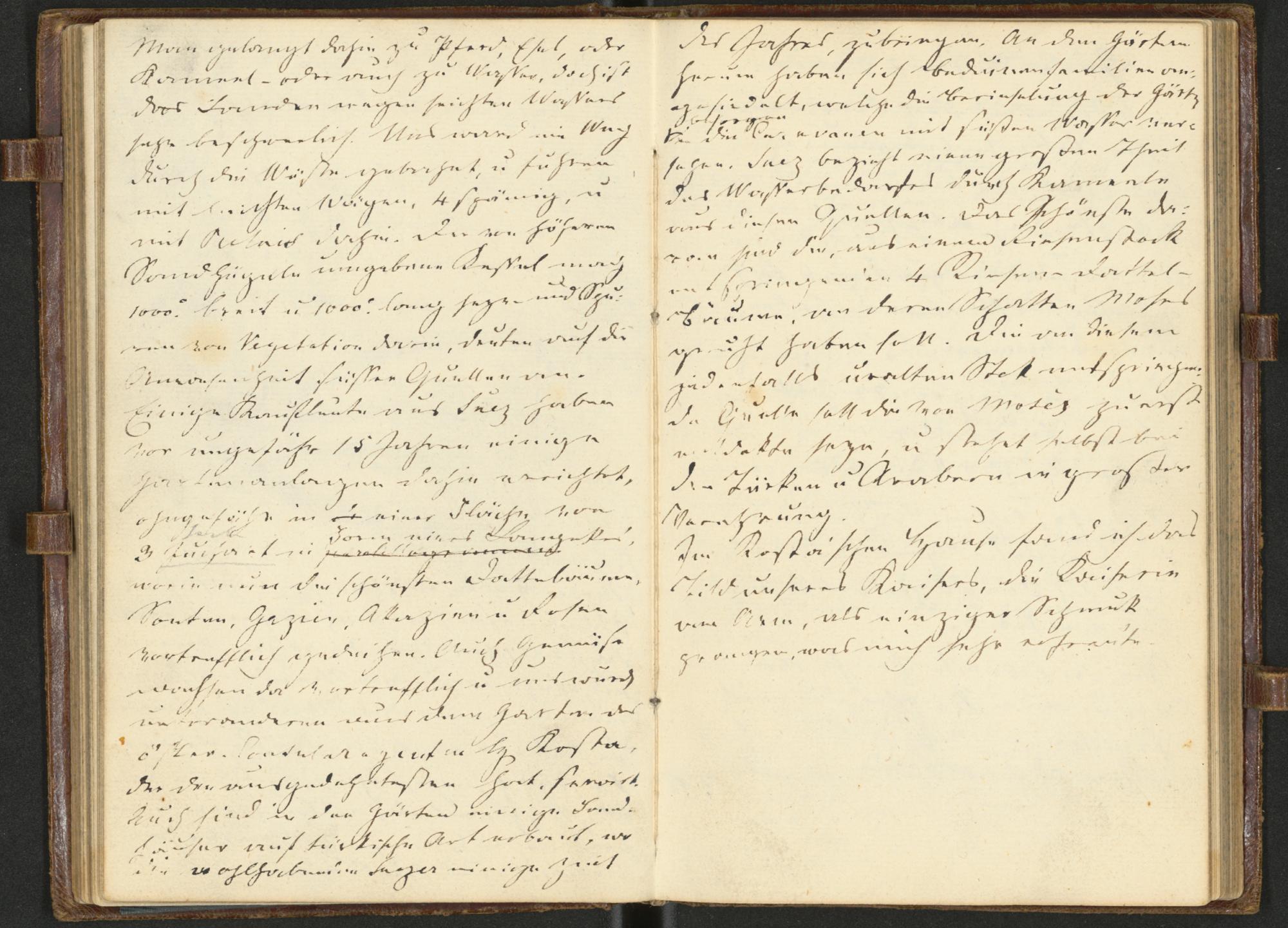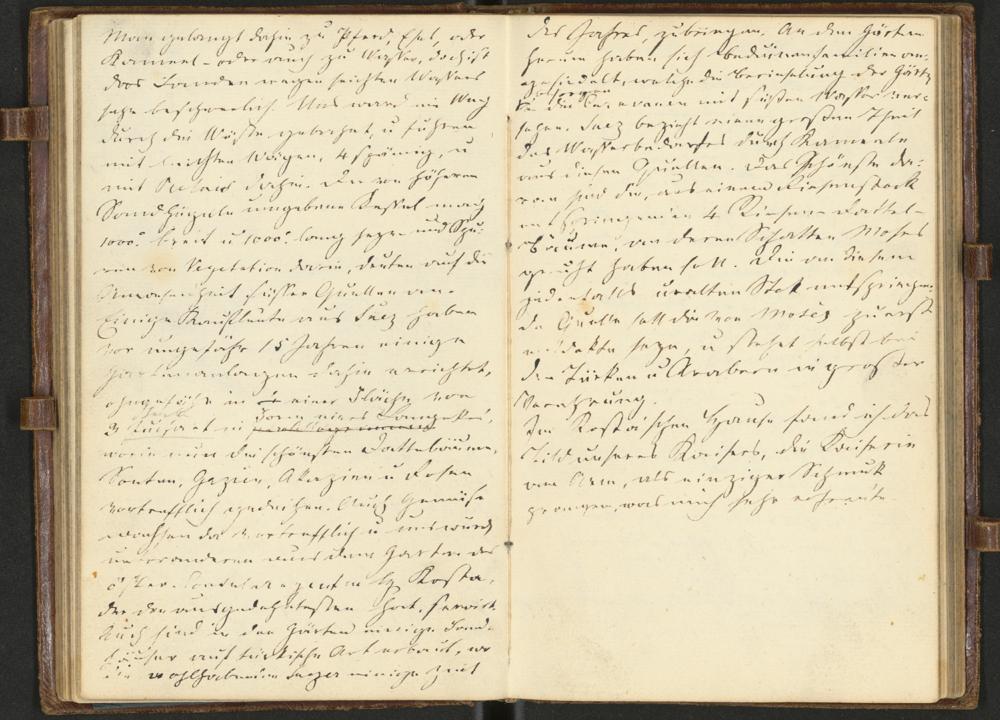 Man gelangt dahin zu Pferd, Esel oderKameel – oder auch zu Wasser, doch istdas Landen wegen seichten Wasserssehr beschwerlich. Uns ward ein Wegdurch die Wüste gebahnt, u(nd) fuhrenmit leichten Wägen, 4 spännig, u(nd)mit Relais dahin. Der von höherenSandhügeln umgebene Kessel mag1000° breit u(nd) 1000° lang seyn und Spu-ren von Vegetation darin deuten auf dieAnwesenheit süsser Quellen an.Einige Kaufleute aus Suez habenvor ungefähr 15 Jahren einigeGartenanlagen dahin errrichtet,ohngefähr in einer Fläche von3 Juchart[Joch] in Form eines Lange[c]kes,worin nun die schönsten Dattelbäume,Soutanen, Gazien, Akazien u(nd) Rosenvortrefflich gedeihen. Auch Gemüsewachsen da vortrefflich u(nd) uns wurdeunter anderen aus dem Garten desöster(reichischen) Consularagenten H(errn) Kosta,der den ausgedehntensten hat, servirt.Auch sind in den Gärten einige Land-häuser auf türkische Art erbaut, wodie wohlhabenden Suezer einige Zeit