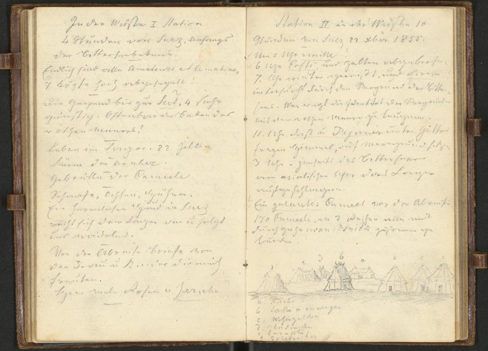 Station II in der Wüste 10Stunden von Suez 22(Dezem)ber 1855.Um 5 Uhr reveille.6 Uhr Caffè und Zelten abgebrochen.7 Uhr weiter gereist, und Linieuntersucht durch den Seegrund des Bitter-sees. Wer wagt die Identität der Seegrundesmit dem rothen Meere zu leugnen.11 Uhr Rast u(nd) Dejeuner3 unter Gottesfreyen Himmel, auf Meeresgrund sitzen.3 Uhr – jenseits des Bitterseesam asiatischen Ufer das Lageraufgeschlagen.Ein galantes Cameel vor der Abreise.170 Cameele , in 2 Reihen alle mitdurchgehenden Stricke zusammen ge-bunden.a. Kircheb. Salle a mangerc. Wohnzelted. bedienstene. lava[...]f.[...]