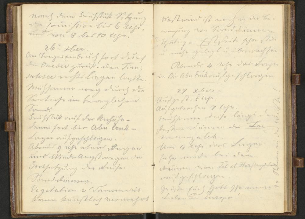 Nach dem Frühstük Sitzungder Commission bis 6 Uhrund von 8 bis 10 Uhr.26.(Dezem)berAm Tagesanbruch fort durchdie [Oaedee] zurük— den Tim-sahsee rechts liegen lassen.Mühsamer Weg durch dieSeetiefe im beweglichenSand.Frühstük auf der Anhöhe –Dann fort bis Abu Eruk –Lager aufgeschlagen.Abends 9 Uhr etwas Regenund Wind – Angst wegen derFortsetzung der Reise.Sandstürme.Vegetation v(on) Tammariskann künstlich vermehrt