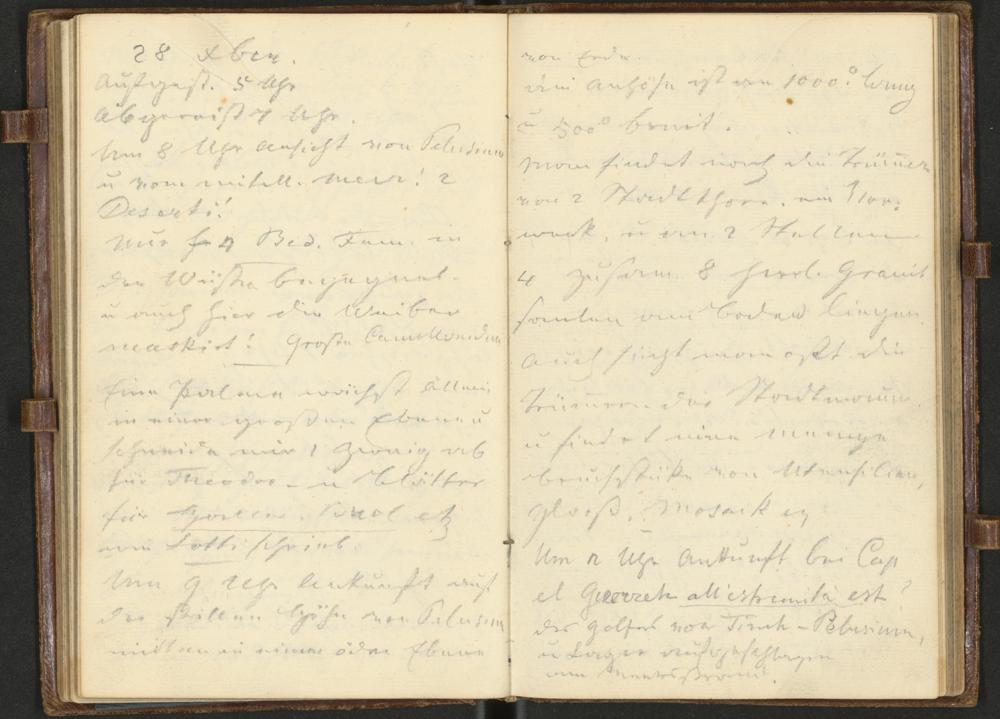 28 DezemberAufgest(anden) 5 UhrAbgereist 7 Uhr.Um 8 Uhr Ansicht von Pelusium u(nd) vom mitell Meer! 2Deserti!Nur 4 Bed(uinen) Glossar ::: zum Glossareintrag ) Fam(ilien) inder Wüste begegnet.u(nd) auch hier die Weibermaskirt! Große Camelweiden .Eine Palme wächst alleinin einer großen Ebene u(nd)schneide mir 1 Zweig abfür Theodor u(nd) Blätterfür Herrn Buol etc.wie Lotti schrieb.Um 9 Uhr Ankunft aufder stillen Höhe von Pelusiummitten in einer öden Ebene