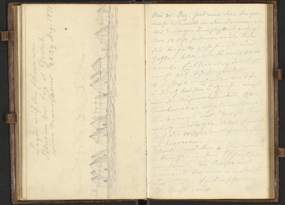 Am 30. Dez(ember) hat man das Lagermehr ostwärts in den Dünen derWüste wegen Feuchtigkeit verlegt.Um 12 Uhr hat man in der Fernedie Fregatte gesehen die unshohlen sollte. Da sie auf 8.000Meter Entfernung das Lagernicht sah, fuhr sie zurük.V. Lesseps u(nd) ich eilten ans Uferu(nd) durch Laufen u(nd) Zeichen erregtenwir die Aufmerksamkeit. EineImbarcation wurde entsendet.Sie kam zu uns. Große Bewe-gung im Lager. Alles freutesich die Wüste endlich verlassenzu können.Abends landeten 4 Chalupen1u(nd) brachten unsere Effectenan Bord. La [Peresse] undArmand kamen an Land.Die Sonden fielen sehr vor-theilhaft aus.