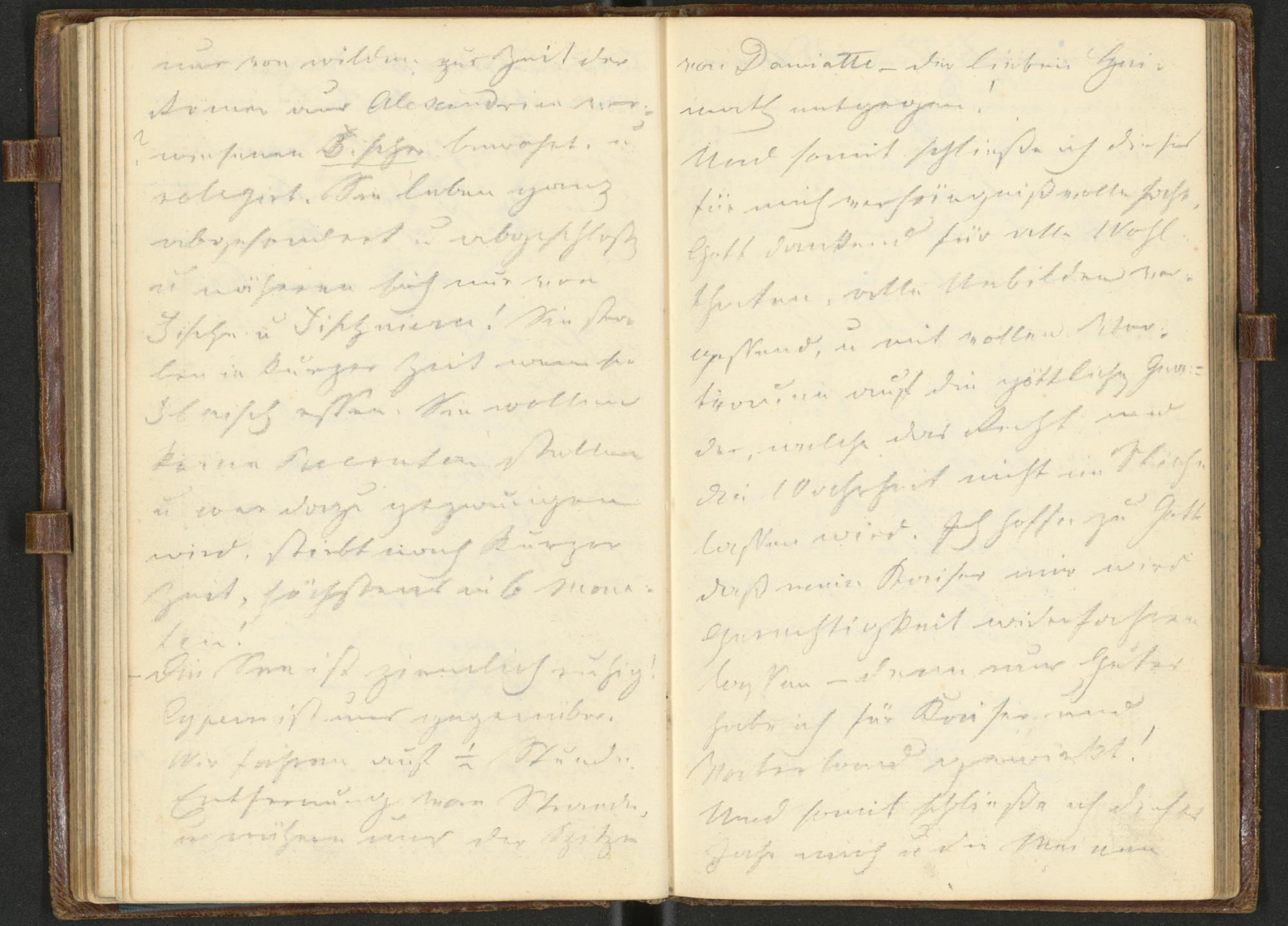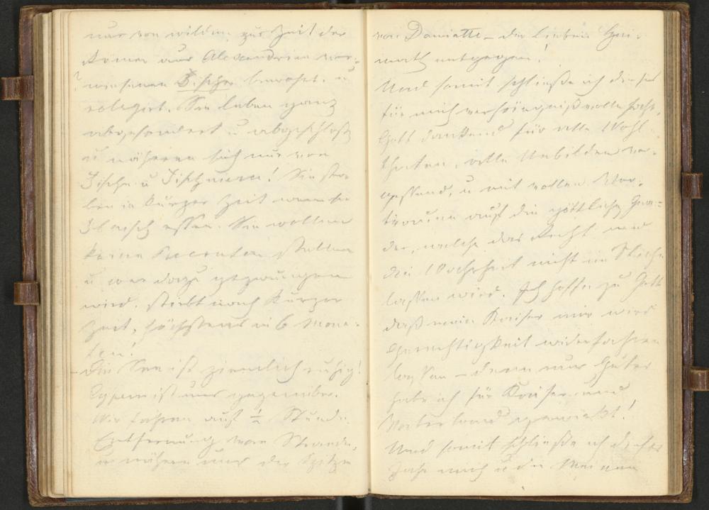 nur von wilden zur Zeit derRömer aus Alexandrien ver-wiesenen Fischer bewohnt u(nd)relegirt. Sie leben ganzabgesondert u(nd) abgeschlossenu(nd) nähren sich nur vonFischen u(nd) Fischeiern! Sie ster-ben in kurzer Zeit wenn sieFleisch essen Glossar ::: zum Glossareintrag essen. Sie wollenkeine Recruten stellenu(nd) wer dazu gezwungenwird, stirbt nach kurzerZeit, höchstens in 6 Mona-ten!Die See ist ziemlich ruhig!Cypern ist uns gegenüber.Wir fahren auf ½ StundeEntfernung vom Strandeu(nd) nähern uns der Spitze