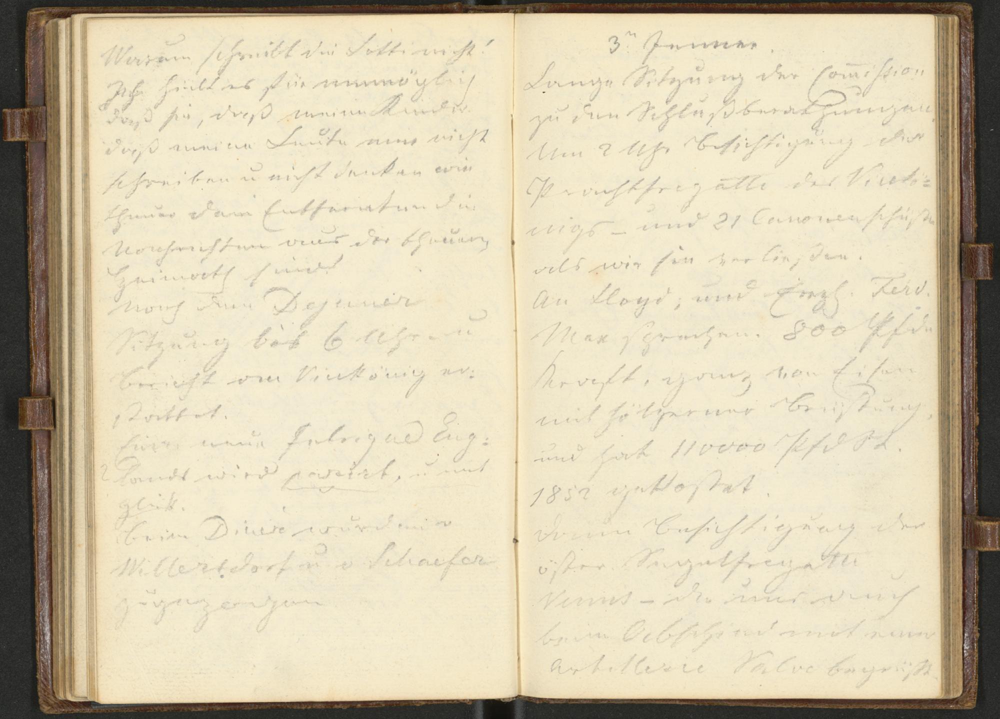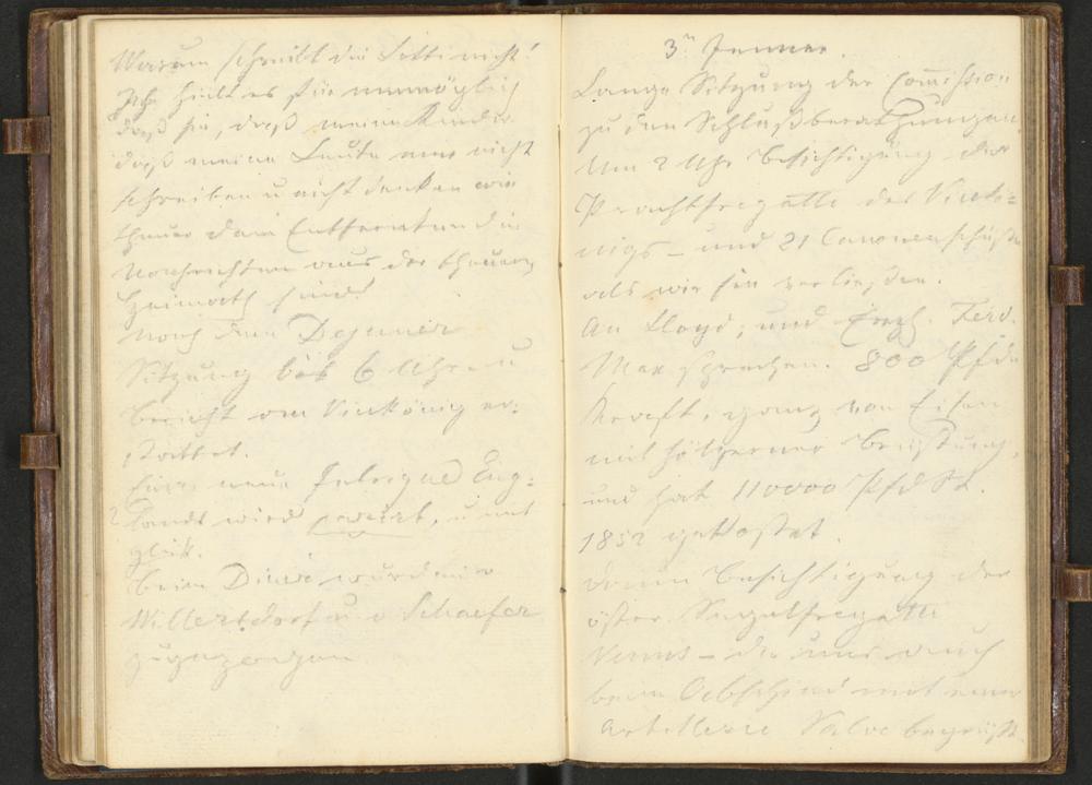 3. Jenner.Lange Sitzung der Commission zu den Schlußberathungen.Um 2 Uhr Besichtigung derPrachtfregatte des Vicekö-nigs – und 21 Canonenschüßeals wir sie verließen.An Lloyd , und Erzh(erzog) Ferd(inand)Max(imilian) sprechen. 800 Pf(er)deKraft, ganz von Eisenmit hölzener Brüstung,und hat 110.000 Pf(un)d St(erling)1852 gekostet.Dann Besichtigung deröster(reichischen) SegelfregatteVenus – die uns auchbeim Abschied mit einerArtillerie Salve begrüßt.