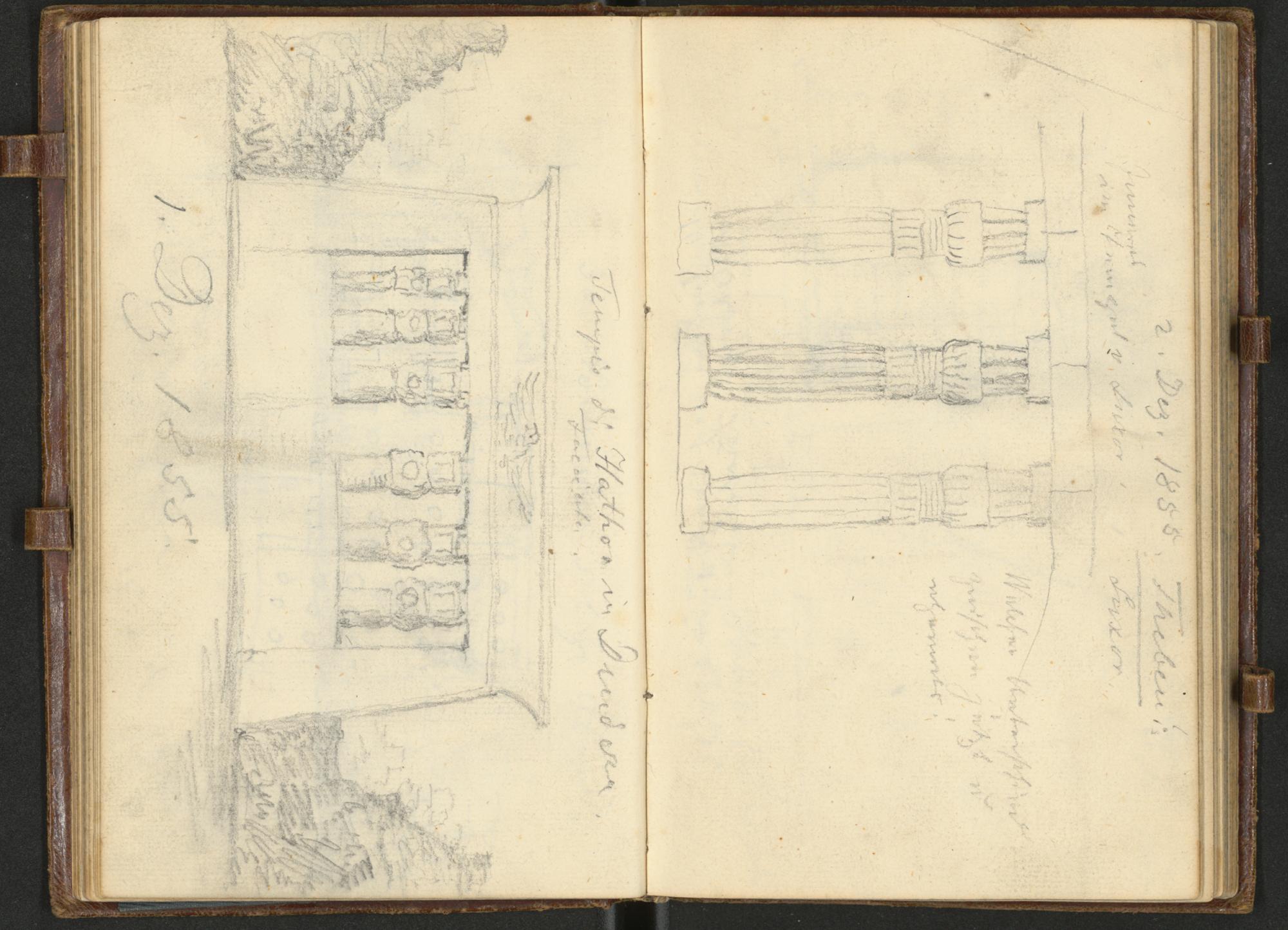 ↩Auf dieser Bleistiftskizze von Negrelli vom 1. Dezember 1855 ist der Pronaos (Eingangsbereich) des Hathor-Tempels von Dendera dargestellt. Negrelli hat die Hathor-Säulen nicht exakt gezeichnet; anstelle der Gesichter der Göttin Hathor hat er in seiner Zeichnung lediglich Kreise eingefügt. Ebenso ungenau ist seine Darstellung des Geiers mit ausgebreiteten Flügeln über dem Eingang. Dort sollte sich eigentlich eine geflügelte Sonne befinden, flankiert von zwei Uraei-Schlangen (Kobras). Links und rechts des Pronaos hat Negrelli grob archäologische Überreste skizziert, die heute nicht mehr sichtbar sind.