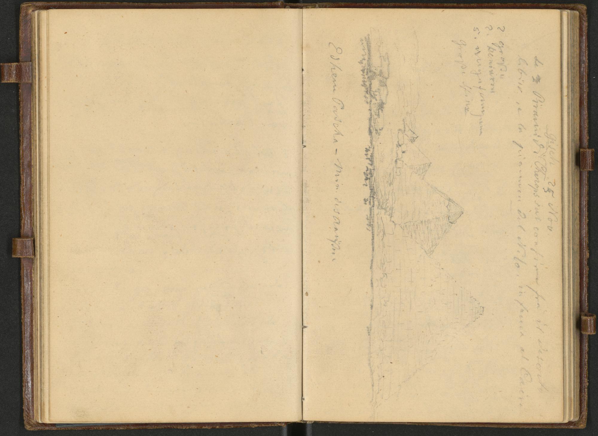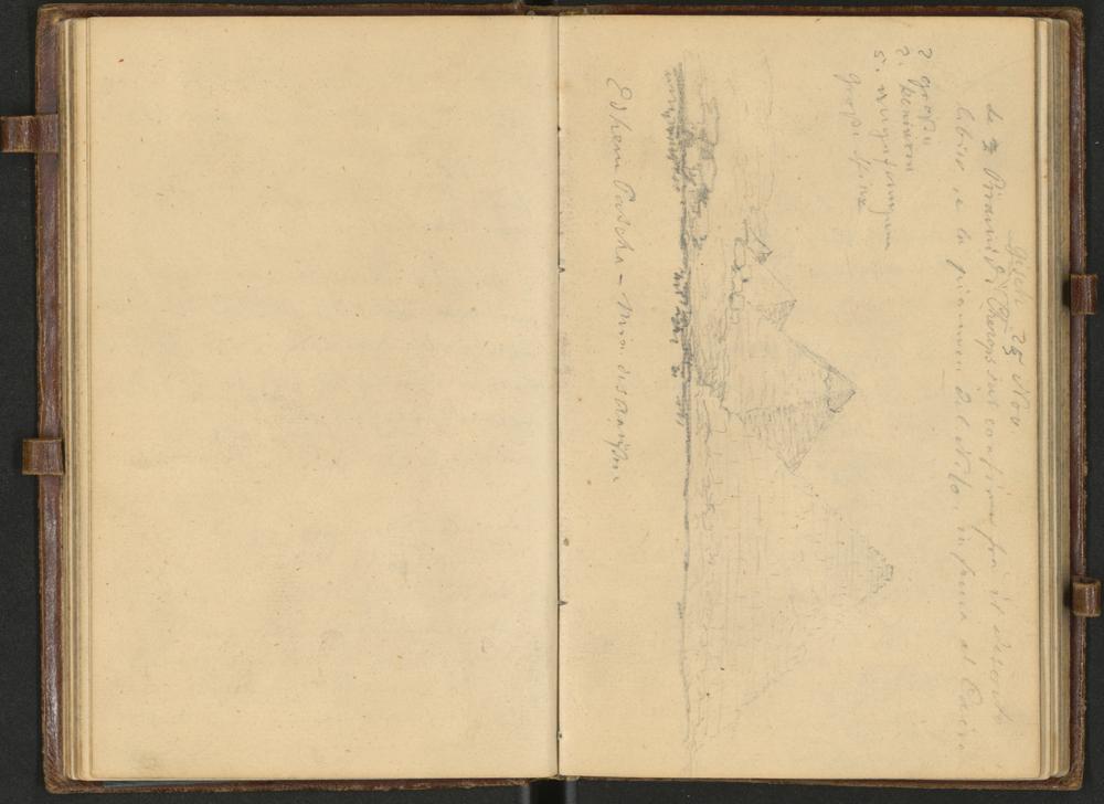 Auf dieser Bleistiftskizze von Negrelli sind die drei größten Pyramiden der 4. Dynastie von Gizeh sowie eine zusätzliche kleinere Pyramide im Hintergrund zu sehen. Der Betrachter der Skizze steht der großen Cheops-Pyramide am nächsten. Cheops, auch bekannt als Chufu (Regierungszeit ca. 2620–2580 v. Chr.), war der zweite König der ägyptischen 4. Dynastie des Alten Reiches. Es folgen die Chephren-Pyramide in der Mitte und die Mykerinos-Pyramide. Die kleine Pyramide neben der Mykerinos-Pyramide dürfte eine der Königinnenpyramiden sein, nämlich die Pyramide GIII-a. Der Blick auf die Pyramiden erfolgt daher von Nordwesten nach Südosten.
