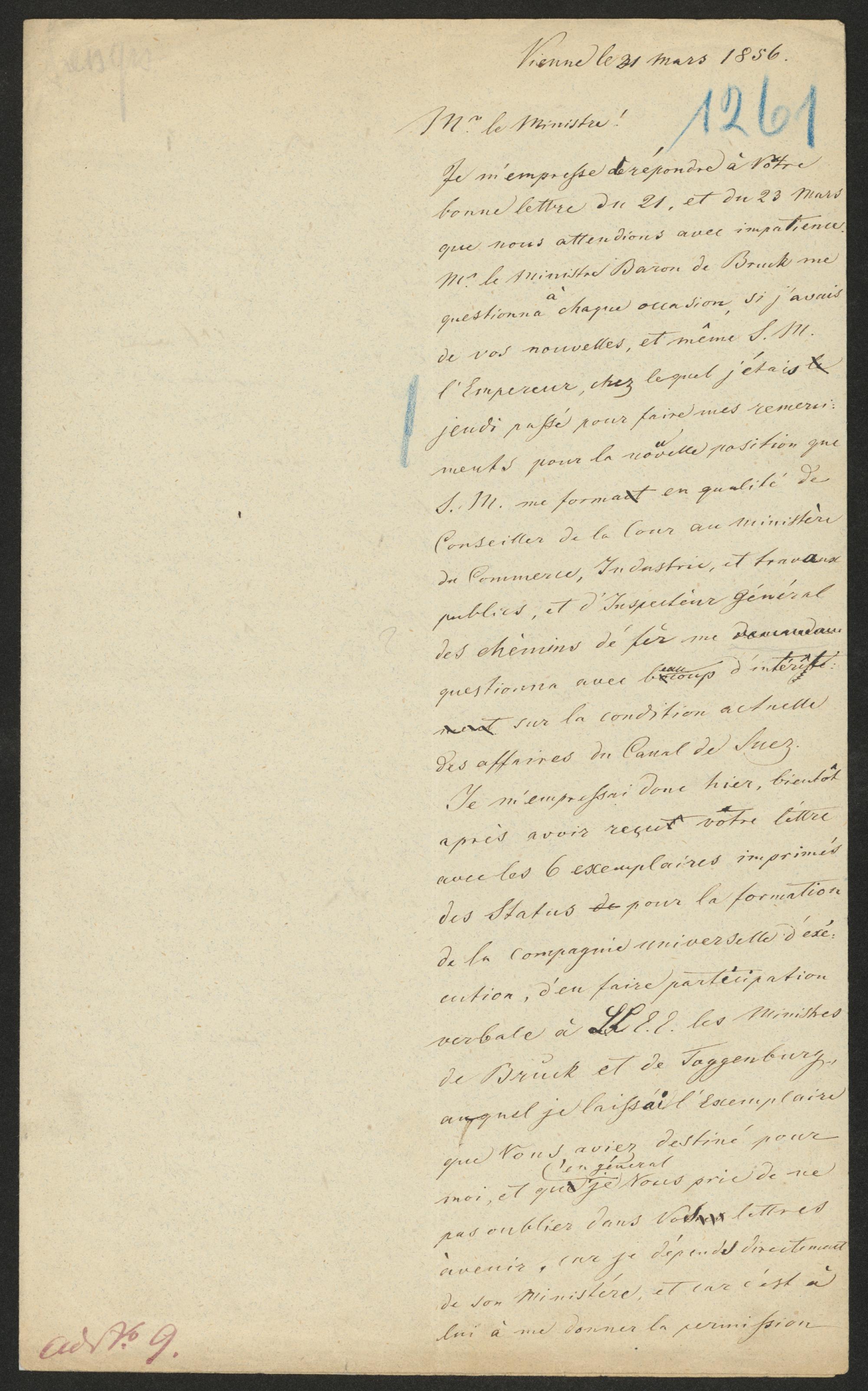 Vienne le 31 mars 1856.Mr. le Ministre!Je m'empresse de répondre à Votrebonne lettre du 21. et du 23 Marsque nous attendions avec impatience.Mr. le Ministre Baron de Bruck mequestionna à chaque occasion, si j'avaisde vos nouvelles, et même S. M.l'Empereur, chez lequel j'étais lejeudi passé pour faire mes remerci-ments pour la nouvelle position queS. M. me format en qualité deConseiller de la Cour an ministèrede Commerce, Industrie, et travauxpublics, et d'Inspecteur Généraldes chèmins de fer mequestionna avec beaucoup d'intéressé:mena sur la condition actuelledes affaires du Canal de Suez.Je m'empressai [done] hier, bientôtaprès avoir reçu votre lettreavec les 6 exemplaires imprimésdes Status de pour la formationde la Compagnie universelle d'exé-cution, d'en faire participationverbale à[?] E. E. les Ministresde Bruck et de Toggenburg,auquel je laissai l'Exemplaireque Vous avier destiné pouren généralmoi, et que je Nous prie de nepas oublier dans Votres lettresàvenir, sur je dépende directementde son Ministère, et sur c'est àlui à me donner la permission