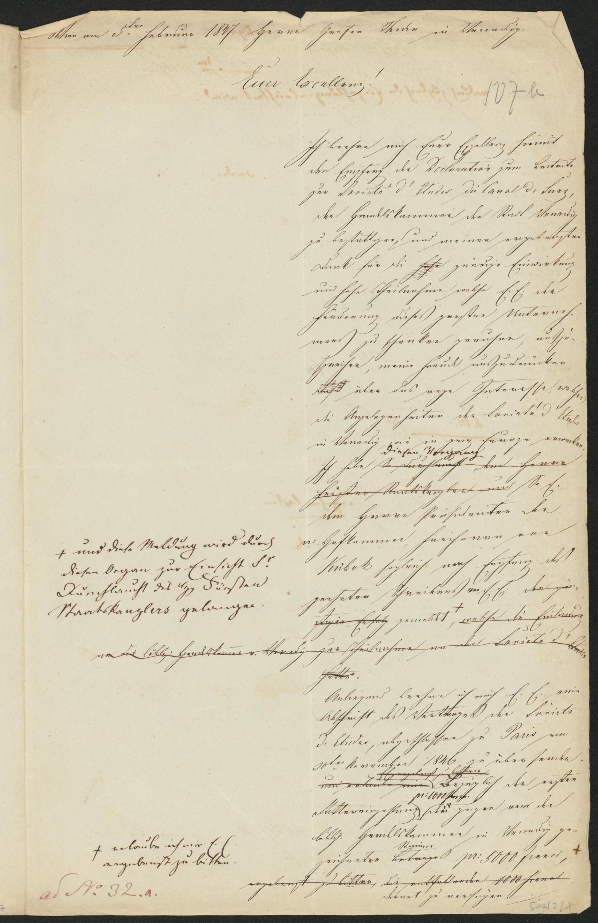Wien am 5. ten Februar 1847. Herrn Grafen Thurn in VenedigEuer Excellenz !Ich beehre mich Euer Excellenz hiemitden Empfang der Declaration zum Beitritezur Societe d'Etudes du Canal de Suez,der Handelskammer der Stadt Venedigzu bestättigen, und meinen ergebenstenDank für die hohe gnädige Einwirkungund hohe Theilnahme welche E. E. derFörderung dieses großen Unterneh-mens zu schenken geruhen , auszu-sprechen, meine Freude auszudrücken.daß über das rege Interesse, welchesdie Angelegenheiten der Societe d'Etudesin Venedig, wie in ganz Europa erwecken.Ich habe diesen Vorgang Sr Durchlaucht dem HerrnFürsten Staatskanzler und S . E .dem Herrn Präsidenten dero. Hofkammer Freiherrn vonKübek sogleich nach Empfang desgeehrten Schreibens von E . E . den günstigen Erfolg gemeldet, welche die Einladungan die löbl . Handelskammer v . Venedig zur Theilnahme an der Societe d ' Edtudeshatte .und diese Meldung wird durchdiesen Organ zur Einsicht Sr.Durchlaucht des H. FürstenStaatskanzlers gelangen.Anliegend beehre ich mich E. E. eineAbschrift des Vertrages der Societed'Etudes , abgeschlossen zu Paris am30ten November 1846 zu übersenden.und erlaube mir E . E . ergebenst zu bitten Bezüglich der erstenpr . 1000 FrancsRatteneinzahlung de gegen von derlöblich. Handelskammer in Venedig ge-zeichneter Betrages pr . 5000 francs,+ erlaube ich mir E. E.ergebenst zu bitten.ergebenst zu bitten, die entfellenden 1000 francsderart zu verfügen.