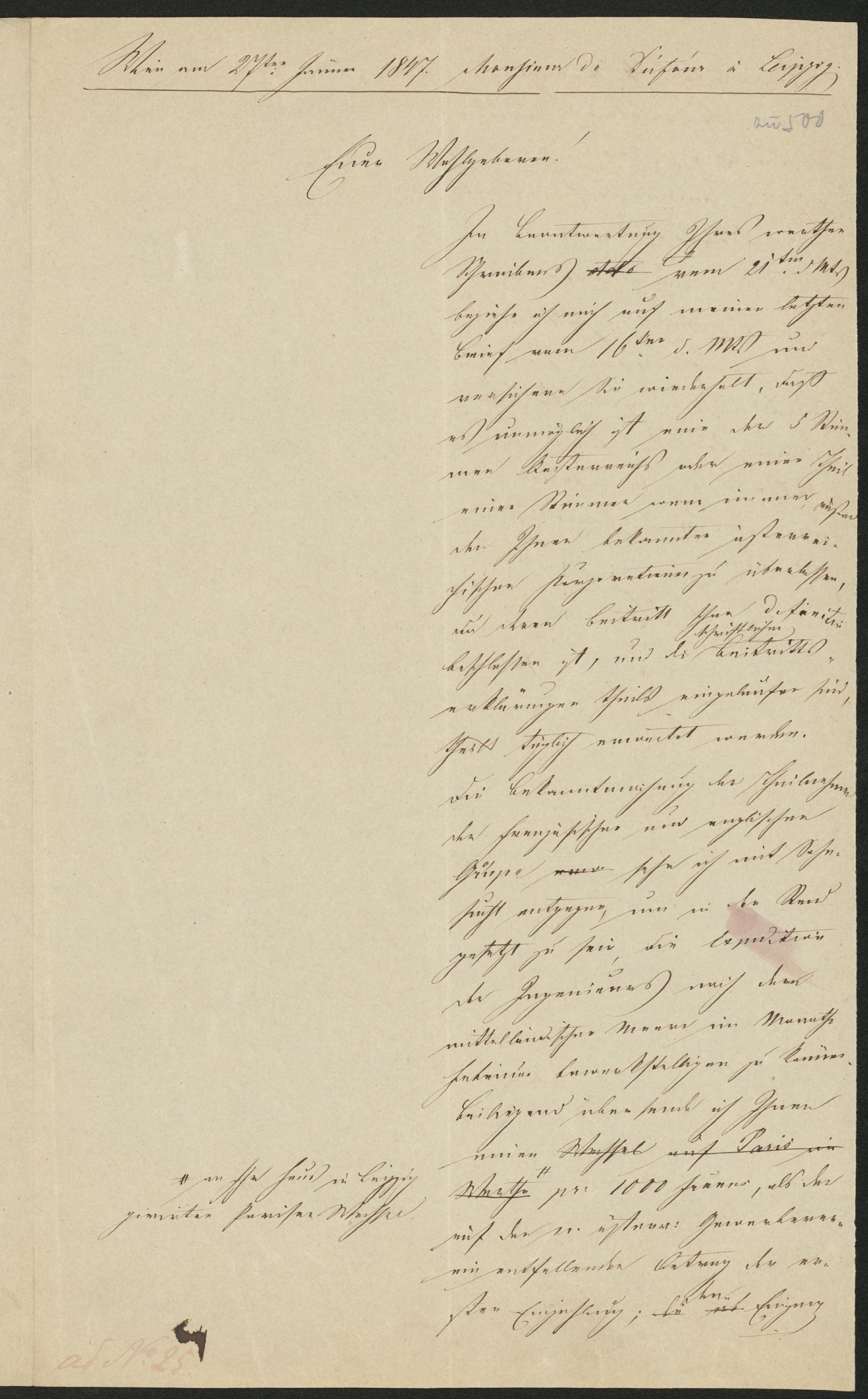 Wien am 27ten Jänner 1847 . Monsieur de Dufour à Leipzig .Euer Wohlgeboren!In Beantwortung Ihres werthenSchreibens vom 21 . ten d . Mts.beziehe ich mich auf meinen letztenBrief vom 16ten d. Mts. undversichere Sie wiederholt , daßes unmöglich ist eine der 5 Stim-men Oesterreichs oder einen Theileiner Stimmer wem immer außerden Ihnen bekannten österrei-chischen Korporationen zu überlassen,da deren Beitritt schon definitivschriftlichenbeschloßen ist , und die Beitritts-erklärungen theils eingelaufen sind,theils täglich erwartet werden.Die Bekanntmachung der Theilnahmeder französischen und englischenGruppe sehe ich mit Sehn-sucht entgegen , um in den Standgesetzt zu sein, die Expeditionder Ingenieurs nach demmittelländischen Meere im MonatheFebruar bewerkstelligen zu können.Beiliegend über sende ich Ihneneinen Wechsel auf Paris iman Ihr Haus in Leipzig[unleserlich] Pariser WechselWerthe pr . 1000 francs , als derauf den n . österr : Gewerbever-ein entfallenden Antrag der er-Densten Einzahlung; Eingang