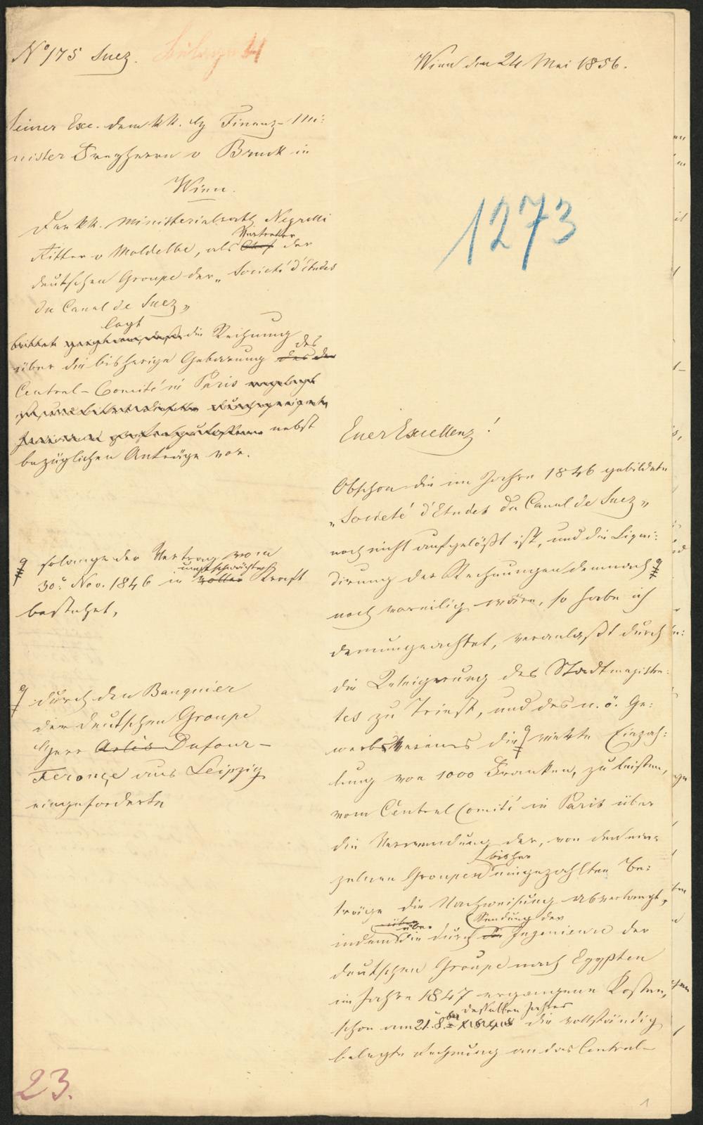No 175 SuezSeiner Exc. dem kk. Hr. Finanz-Mi-nister Freyherrn v. Bruck inWien.Der kk. Ministerialrath NegrelliRitter v Moldelbe, als Vertreter derdeutschen Groupe der"Societé d'Etudesdu Canal de Suez"legt die Rechnungüber die bisherige Gebarung desCentral-Comité in Paris [angelangt]ist, und bittet dieselbe durch[...]Individuen[prüfen zu lassen nebstbezüglichen Anträge vor.