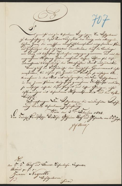 Brief vom Sprecher seiner Majestät der König von Preußen: Mitteilung der Erhaltung der Pläne und Skizzen bezüglich der Durchstechung der Landenge von Suez. Geschrieben von Arnim an Negrelli am 3. Februar 1848, Wien.