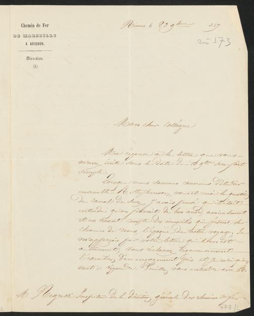Brief von Talabot an Negrelli bezüglich der Ägyptenexpedition der drei leitenden Ingenieure der Société d'Études du Canal de Suez, Negrelli, Talabot und Stephenson. Geschrieben am 23. November 1847, Nîmes.