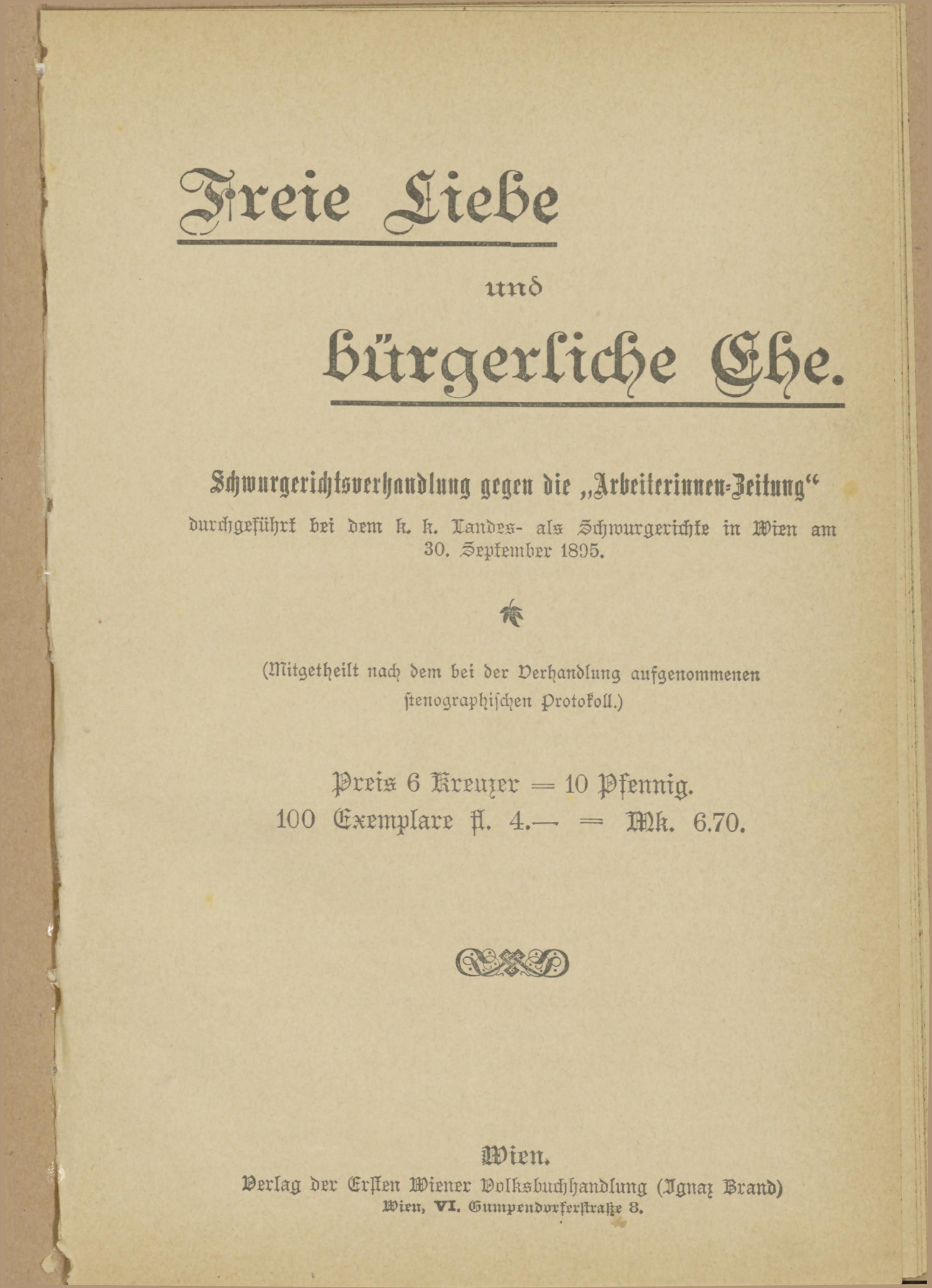Freie Liebe und bürgerliche Ehe. Schwurgerichtsverhandlung gegen die "Arbeiterinnen-Zeitung"