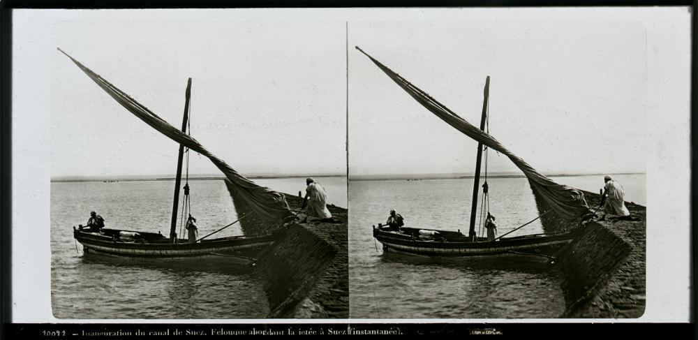 SD-01-3807: Einweihung des Suezkanals, Momentaufnahme der Annäherung einer Feluke (ägyptischen Segelschiffes) an dem Wellenbrecher in Suez