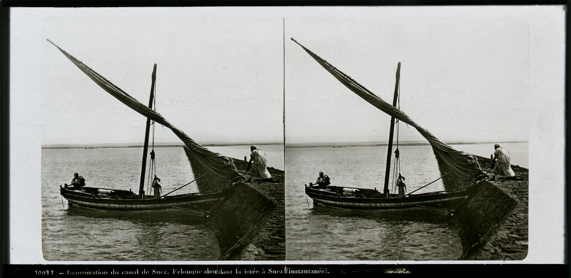 Einweihung des Suezkanals, Momentaufnahme der Annäherung einer Feluke (ägyptischen Segelschiffes) an dem Wellenbrecher in Suez