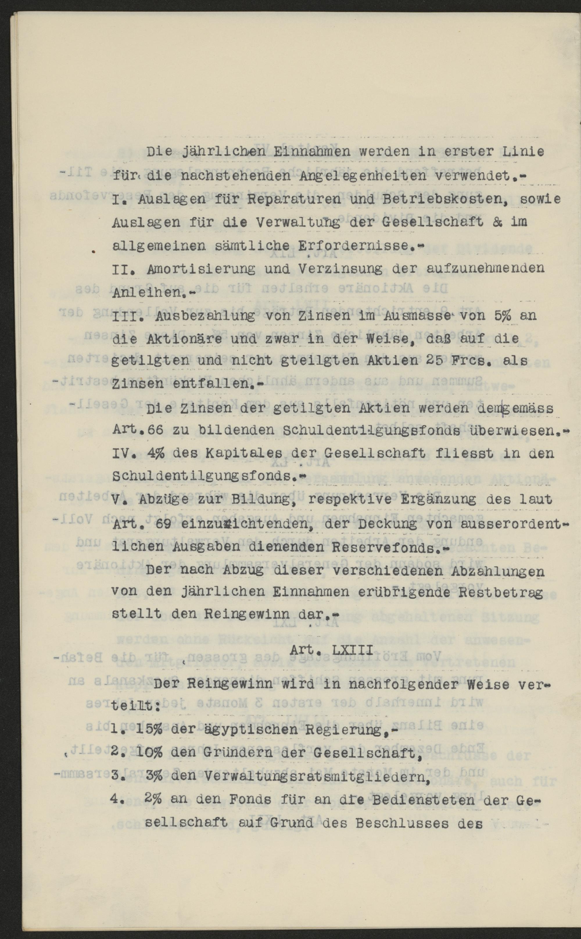 Die jährlichen Einnahmen werden in erster Liniefür die nachstehenden Angelegenheiten verwendet.-I. Auslagen für Reparaturen und Betriebskosten, sowieAuslagen für die Verwaltung der Gesellschaft& imallgemeinen sämtliche Erfordernisse.-II. Amortisierung und Verzinsung der aufzunehmendenAnleihen.-III. Ausbezahlung von Zinsen im Ausmasse von 5% andie Aktionäre und zwar in der Weise, daß auf diegetilgten und nicht getilgten Aktien 25 Frcs. alsZinsen entfallen.-Die Zinsen der getilgten Aktien werden dem gemässArt. 66 zu bildenden Schuldentilgungsfonds überwiesen.-IV. 4% des Kapitales der Gesellschaft fliesst in denSchuldentilgungsfonds.-V. Abzüge zur Bildung, respektive Ergänzung des lautArt. 69 einzurichtenden, der Deckung von ausserordent-lichen Ausgaben dienenden Reservefonds.-Der nach Abzug dieser verschiedenen Abzahlungenvon den jährlichen Einnahmen erübrigende Restbetragstellt den Reingewinn dar.-Art. LXIIIDer Reingewinn wird in nachfolgender Weise ver-teilt:1. 15% der ägyptischen Regierung,2. 10% den Gründern der Gesellschaft,3. 3% den Verwaltungsratsmitgliedern,4. 2% an den Fonds für an die Bediensteten der Ge-sellschaft auf Grund des Beschlusses des
