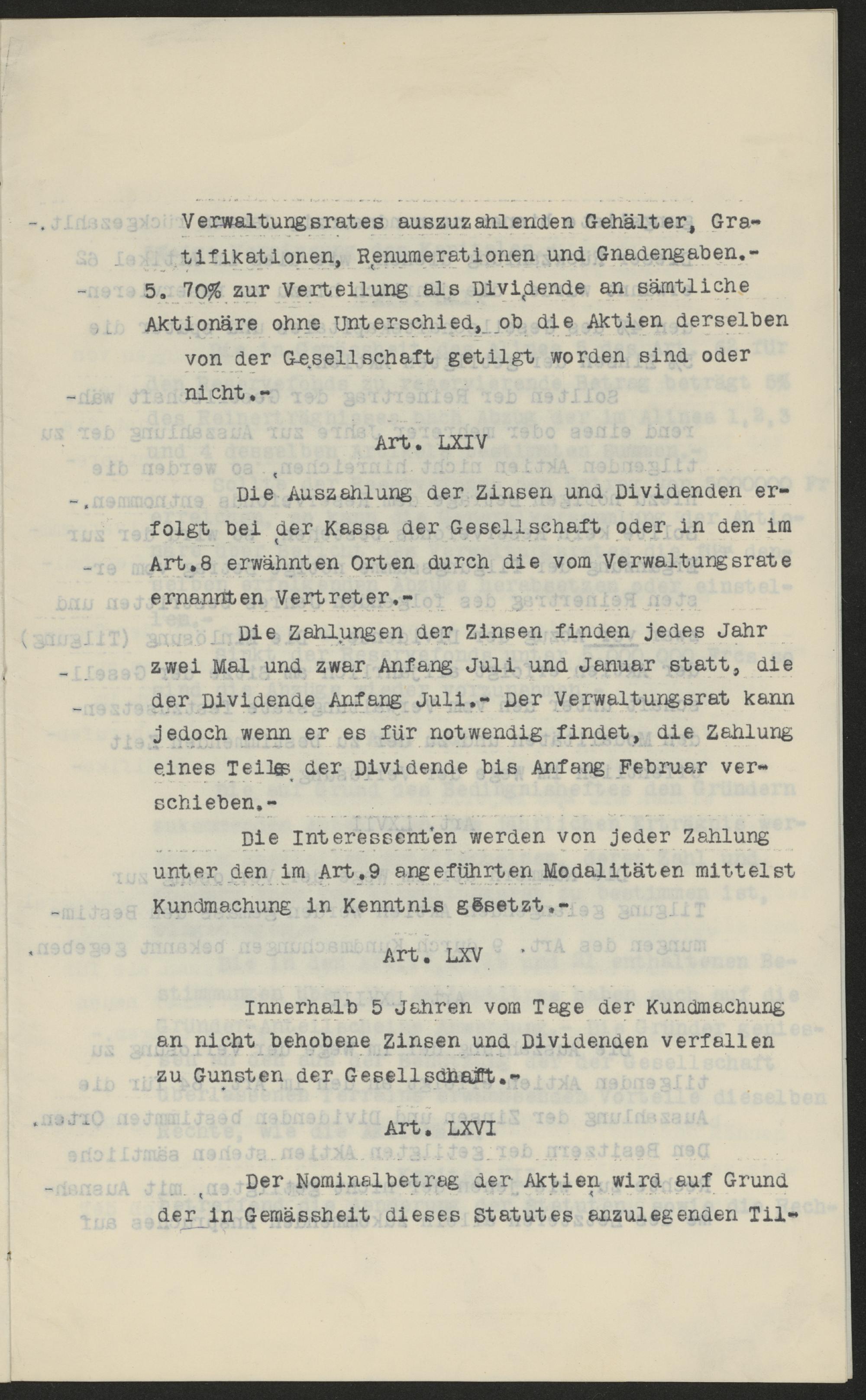 Verwaltungsrates auszuzahlenden Gehälter, Gra-tifikationen, Renumerationen und Gnadengaben.-5. 70% zur Verteilung als Dividende an sämtlicheAktionäre ohne Unterschied, ob die Aktien derselbenvon der Gesellschaft getilgt worden sind odernicht.-Art. LXIVDie Auszahlung der Zinsen und Dividenden er-folgt bei der Kassa der Gesellschaft oder in den imArt.8 erwähnten Orten durch die vom Verwaltungsrateernannten Vertreter.-Die Zahlungen der Zinsen finden jedes Jahrzwei Mal und zwar Anfang Juli und Januar statt, dieder Dividende Anfang Juli.- Der Verwaltungsrat kannjedoch wenn er es für notwendig findet, die Zahlungeines Teiles der Dividende bis Anfang Februar ver-schieben.-Die Interessenten werden von jeder Zahlungunter den im Art.9 angeführten Modalitäten mittelstKundmachung in Kenntnis gesetzt.-Art. LXVInnerhalb 5 Jahren vom Tage der Kundmachungan nicht behobene Zinsen und Dividenden verfallenzu Gunsten der Gesellschaft.-Art. LXVIDer Nominalbetrag der Aktien wird auf Grundder in Gemässheit dieses Statutes anzulegenden Til-