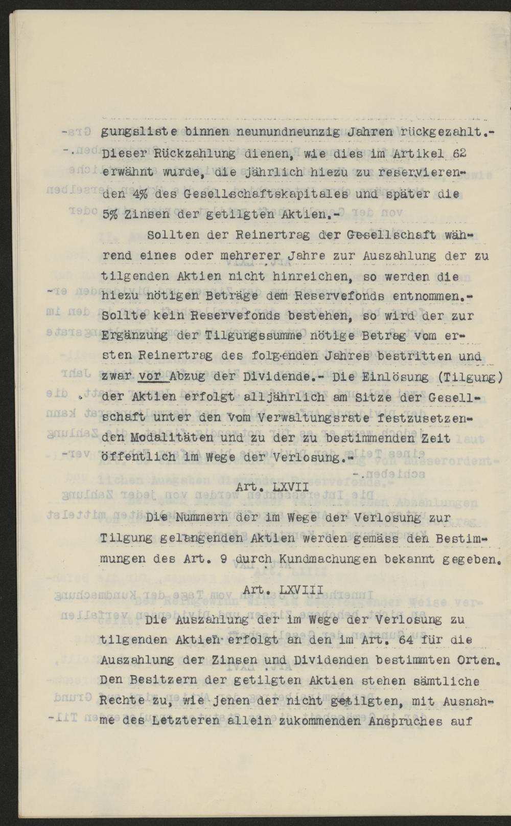 gungsliste binnen neunundneunzig Jahren rückgezahlt.-Dieser Rückzahlung dienen, wie dies im Artikel 62erwähnt wurde, die jährlich hiezu zu reservieren-den 4% des Gesellschaftskapitales und später die5% Zinsen der getilgten Aktien.-Sollten der Reinertrag der Gesellschaft wäh-rend eines oder mehrerer Jahre zur Auszahlung der zutilgenden Aktien nicht hinreichen, so werden diehiezu nötigen Beträge dem Reservefonds entnommen.-Sollte kein Reservefonds bestehen, so wird der zurErgänzung der Tilgungssumme nötige Betrag vom er-sten Reinertrag des folgenden Jahres bestritten undzwar vor Abzug der Dividende.- Die Einlösung(Tilgung)der Aktien erfolgt alljährlich am Sitze der Gesell-schaft unter den vom Verwaltungsrate festzusetzen.den Modalitäten und zu der zu bestimmenden Zeitöffentlich im Wege der Verlosung.-Art. LXVIIDie Nummern der im Wege der Verlosung zurTilgung gelangenden Aktien werden gemäss den Bestim-mungen des Art. 9 durch Kundmachungen bekannt gegeben.Art. LXVIII.Die Auszahlung der im Wege der Verlosung zutilgenden Aktien erfolgt an den im Art. 64 für dieAuszahlung der Zinsen und Dividenden bestimmten Orten.Den Besitzern der getilgten Aktien stehen sämtlicheRechte zu, wie jenen der nicht getilgten, mit Ausnah-me des Letzteren allein zukommenden Anspruches auf