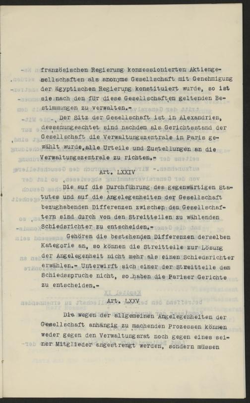 französischen Regierung konzessionierten Aktienge-sellschaften als anonyme Gesellschaft mit Genehmigungder ägyptischen Regierung konstituiert wurde, so istsie nach den für diese Gesellschaften geltenden Be-stimmungen zu verwalten.-Der Sitz der Gesellschaft ist in Alexandrien,dessenungeachtet sind nachdem als Gerichtsstand derGesellschaft die Verwaltungszentrale in Paris ge-wählt wurde, alle Urteile und Zustellungen an dieVerwaltungszentrale zu richten.-Art. LXXIVDie auf die Durchführung des gegenwärtigen Sta-tutes und auf die Angelegenheiten der Gesellschaftbezughabenden Differenzen zwischen den Gesellschaf-tern sind durch von den Streitteilen zu wählendenSchiedsrichter zu entscheiden.-Gehören die bestehenden Differenzen derselbenKategorie an, so können die Streitteile zur Lösungder Angelegenheit nicht mehr als einen Schiedsrichtererwählen.- Unterwirft sich einer der Streitteile demSchiedsspruche nicht, so haben die Pariser Gerichtezu entscheiden.-Art. LXXVDie wegen der allgemeinen Angelegenheiten derGesellschaft anhängig zu machenden Prozessen könnenweder gegen den Verwaltungsrat noch gegn eines sei-ner Mitglieder angestrengt werden, sondern müssen