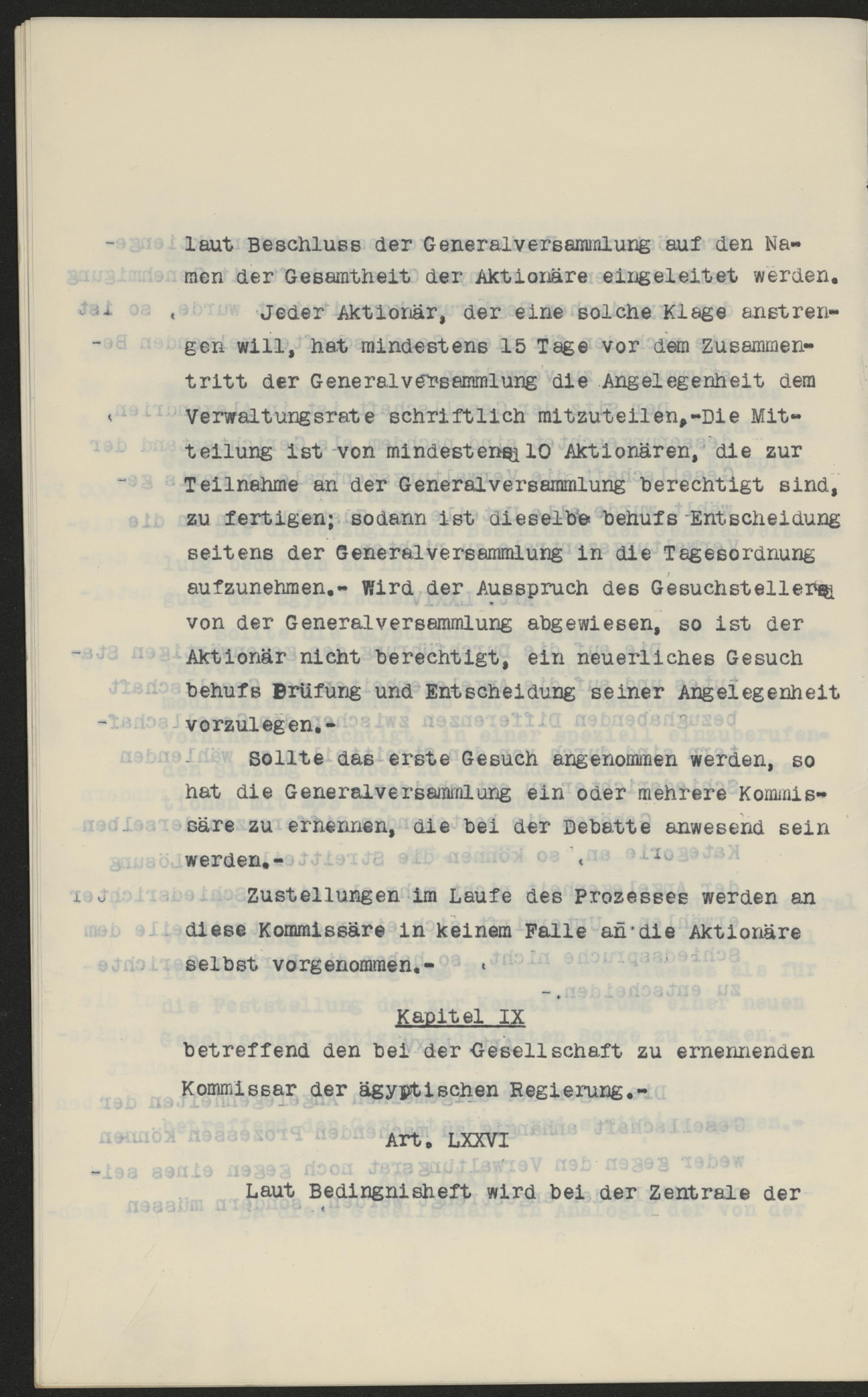 laut Beschluss der Generalversammlung auf den Na-men der Gesamtheit der Aktionäre eingeleitet werden.Jeder Aktionär, der eine solche Klage anstren-gen will, hat mindestens 15 Tage vor dem Zusammen-tritt der Generalversammlung die Angelegenheit demVerwaltungsrate schriftlich mitzuteilen.- Die Mit-teilung ist von mindestens 10 Aktionären, die zurTeilnahme an der Generalversammlung berechtigt sind,zu fertigen; sodann ist dieselbe behufs Entscheidungseitens der Generalversammlung in die Tagesordnungaufzunehmen.- Wird der Ausspruch des Gesuchstellersvon der Generalversammlung abgewiesen, so ist derAktionär nicht berechtigt, ein neuerliches Gesuchbehufs Prüfung und Entscheidung seiner Angelegenheitvorzulegen.-Sollte das erste Gesuch angenommen werden, sohat die Generalversammlung ein oder mehrere Kommis-säre zu ernennen, die bei der Debatte anwesend seinwerden.-Zustellungen im Laufe des Prozesses werden andiese Kommissäre in keinem Falle an die Aktionäreselbst vorgenommen.-Kapitel IXbetreffend den bei der Gesellschaft zu ernennendenKommissar der ägyptischen Regierung.-Art. LXXVILaut Bedingnisheft wird bei der Zentrale der