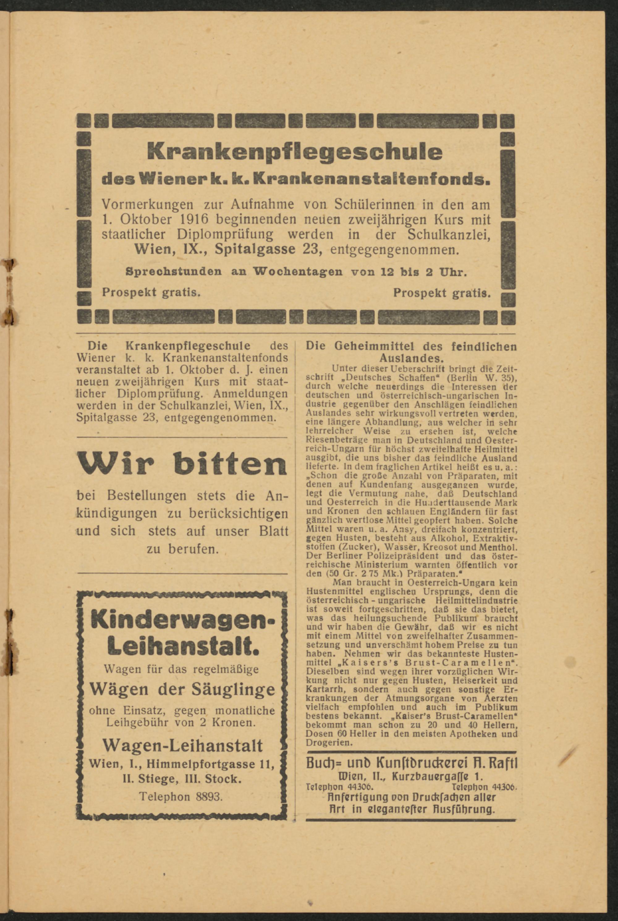 Die Krankenpflegeschule desWiener k. k. Krankenanstaltenfondsveranstaltet ab 1. Oktober d. J. einenneuen zweijährigen Kurs mit staat-licher Diplomprüfung. Anmeldungenwerden in der Schulkanzlei, Wien, IX.,Spitalgasse 23, entgegengenommen.