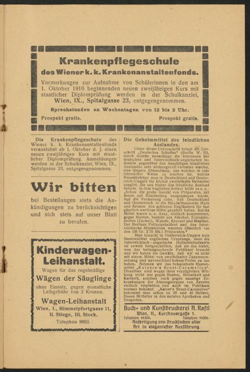 Vormerkungen zur Aufnahme von Schülerinnen in den am1. Oktober 1916 beginnenden neuen zweijährigen Kurs mitstaatlicher Diplomprüfung werden in der Schulkanzlei,Wien, IX., Spitalgasse 23, entgegengenommen.