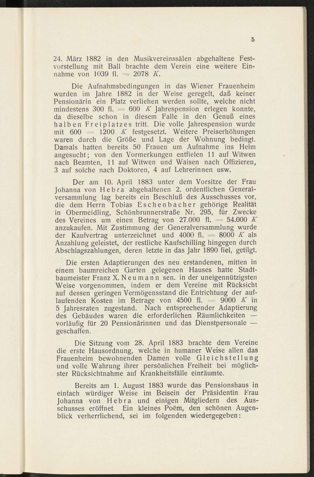 Der am 10. April 1883 unter dem Vorsitze der FrauJohanna von Hebra abgehaltenen 2. ordentlichen General-versammlung lag bereits ein Beschluß des Ausschusses vor,die dem Herrn Tobias Eschenbacher gehörige Realitätin Obermeidling, Schönbrunnerstraße Nr. 295, für Zweckedes Vereines um einen Betrag von 27.000 fl. 54.000 Kanzukaufen. Mit Zustimmung der Generalversammlung wurdeder Kaufvertrag unterzeichnet und 4000 fl. =- 8000 K alsAnzahlung geleistet, der restliche Kaufschilling hingegen durchAbschlagszahlungen, deren letzte in das Jahr 1890 fiel, getilgt.