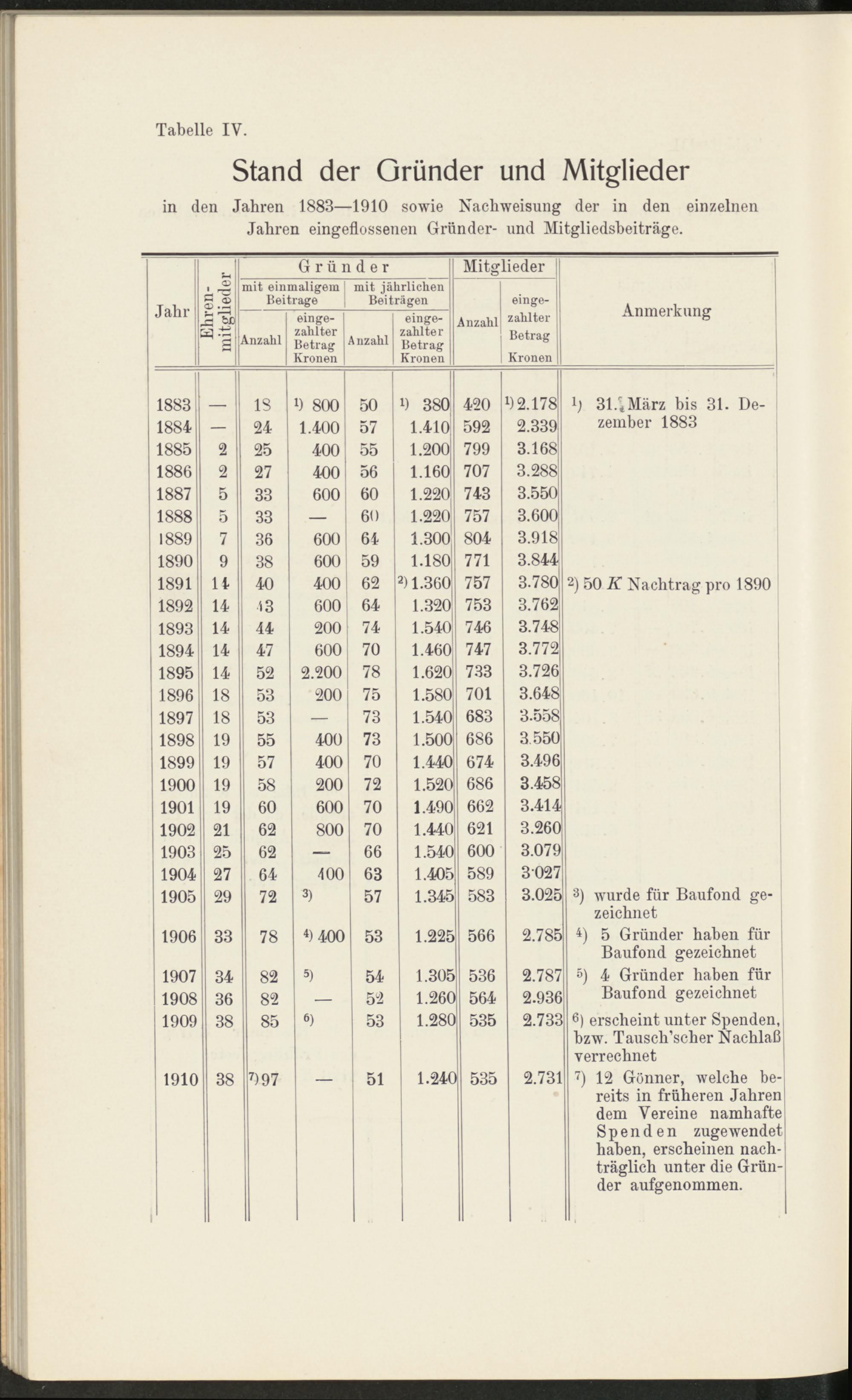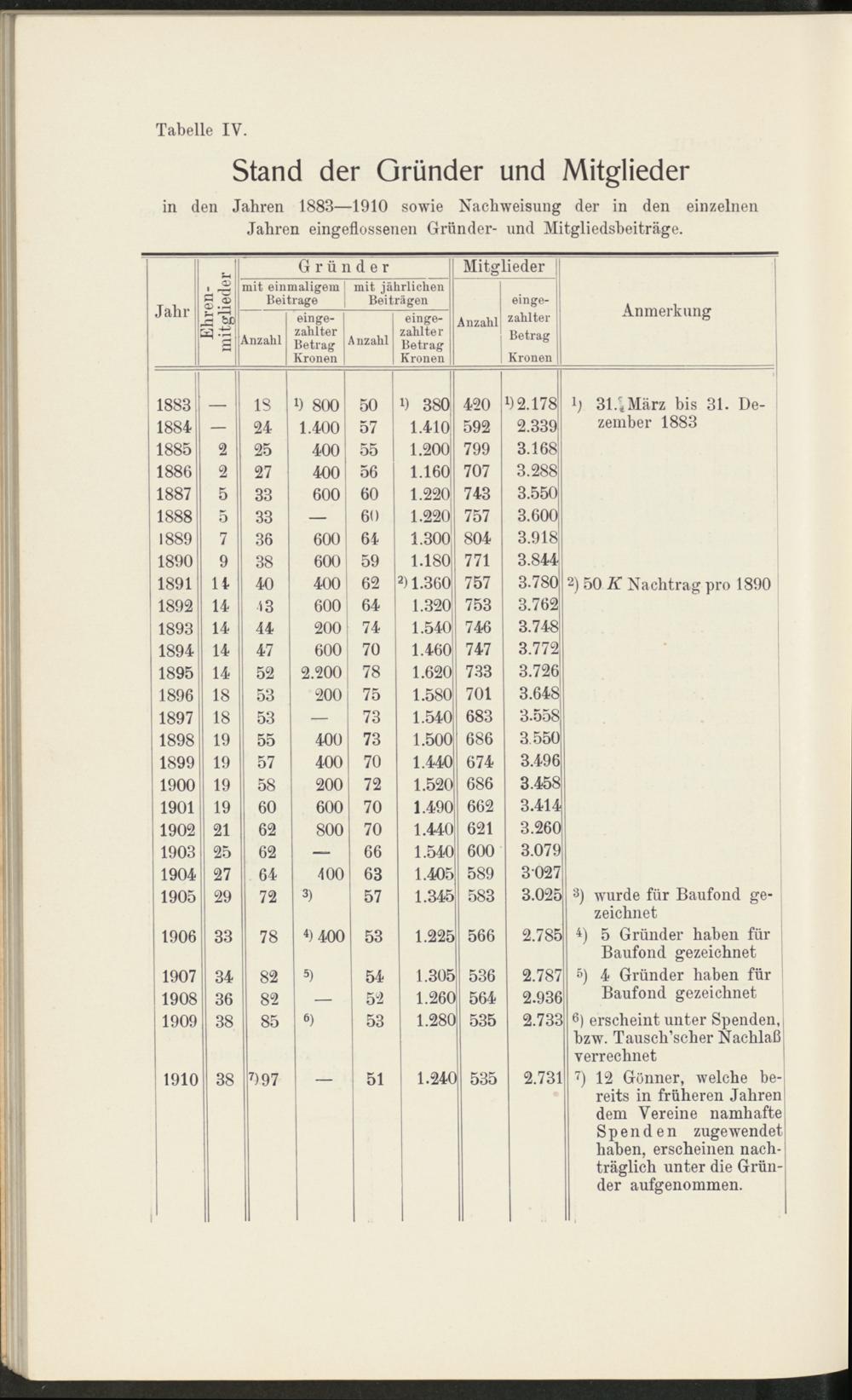 in den Jahren 18831910 sowie Nacliweisung der in den einzelnenJahren eingeflossenen Gründer- und Mitgliedsbeiträge.